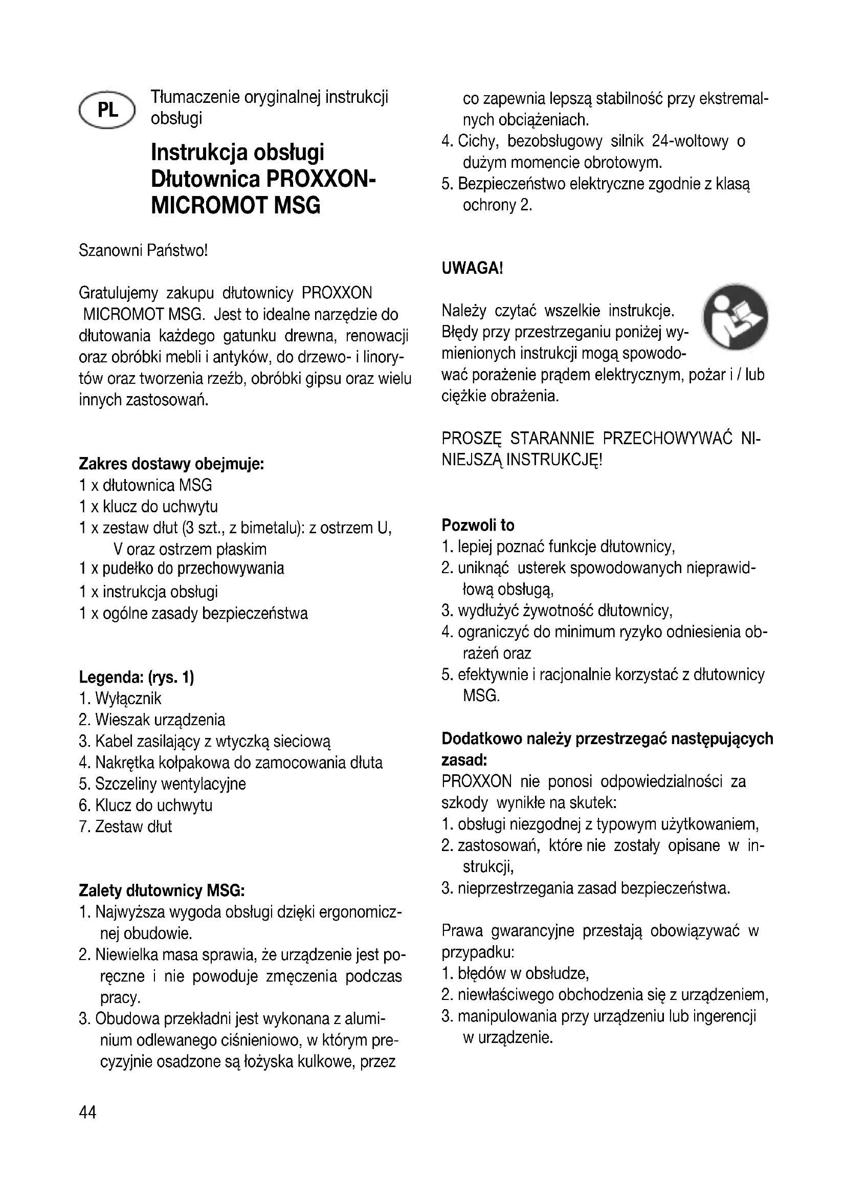 MSG. Dodatkowo należy przestrzegać następujących zasad: PROXXON nie ponosi odpowiedzialności za szkody wynikłe na skutek: