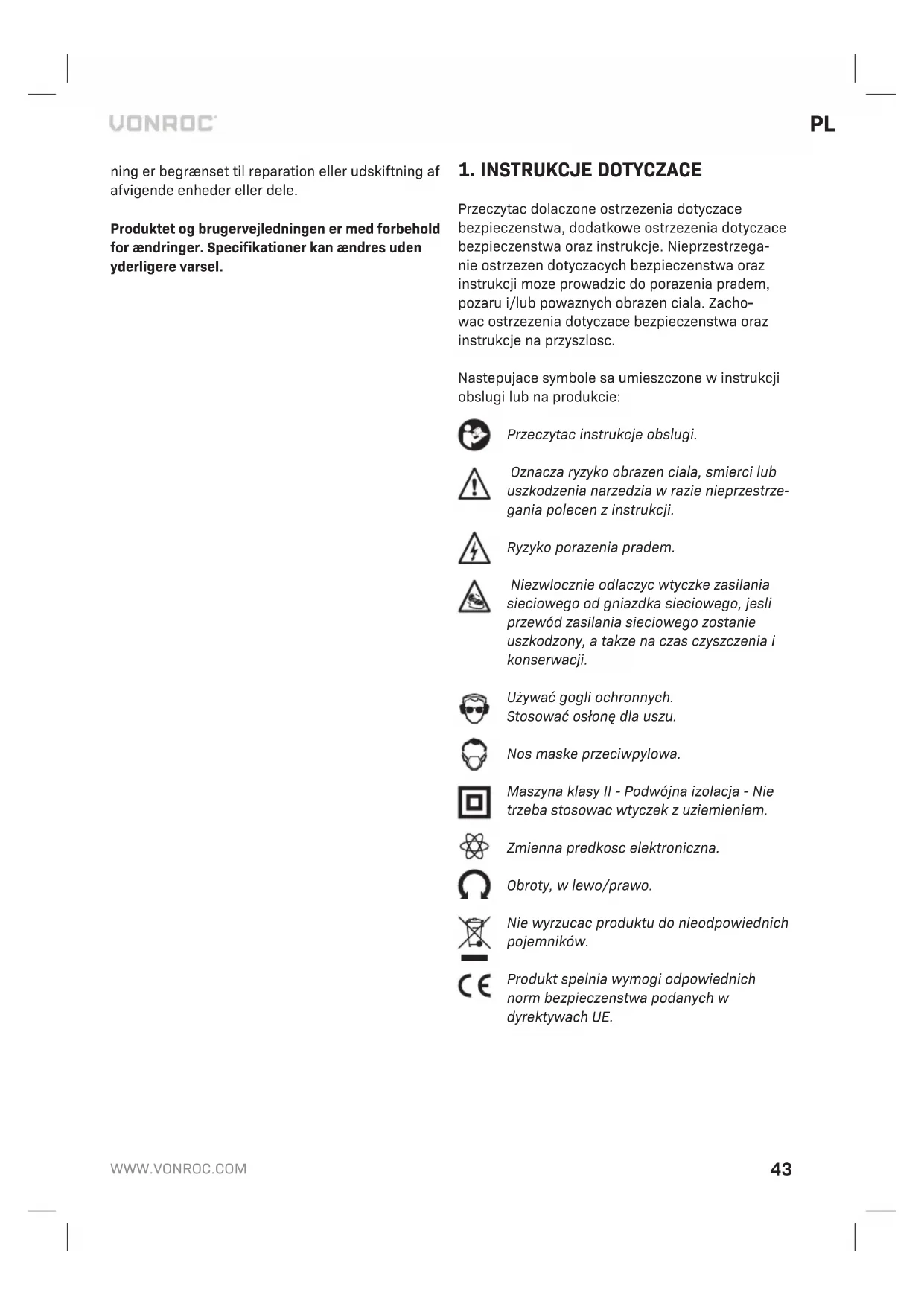 Produkty VONROC są wytwarzane zgodnie z najwyzszymi standardami jakosci i producent udziela gwarancji na wady materiałowe i wady wykonania na okres wymagany prawem, liczac od dnia zakupu. Ješli wystapi usterka produktu w tym okresie spowodowana wadz materiałowā i/lub wadz wykonania, prosze bezposrednio skontaktowac sie sprzedawcā VONROC.