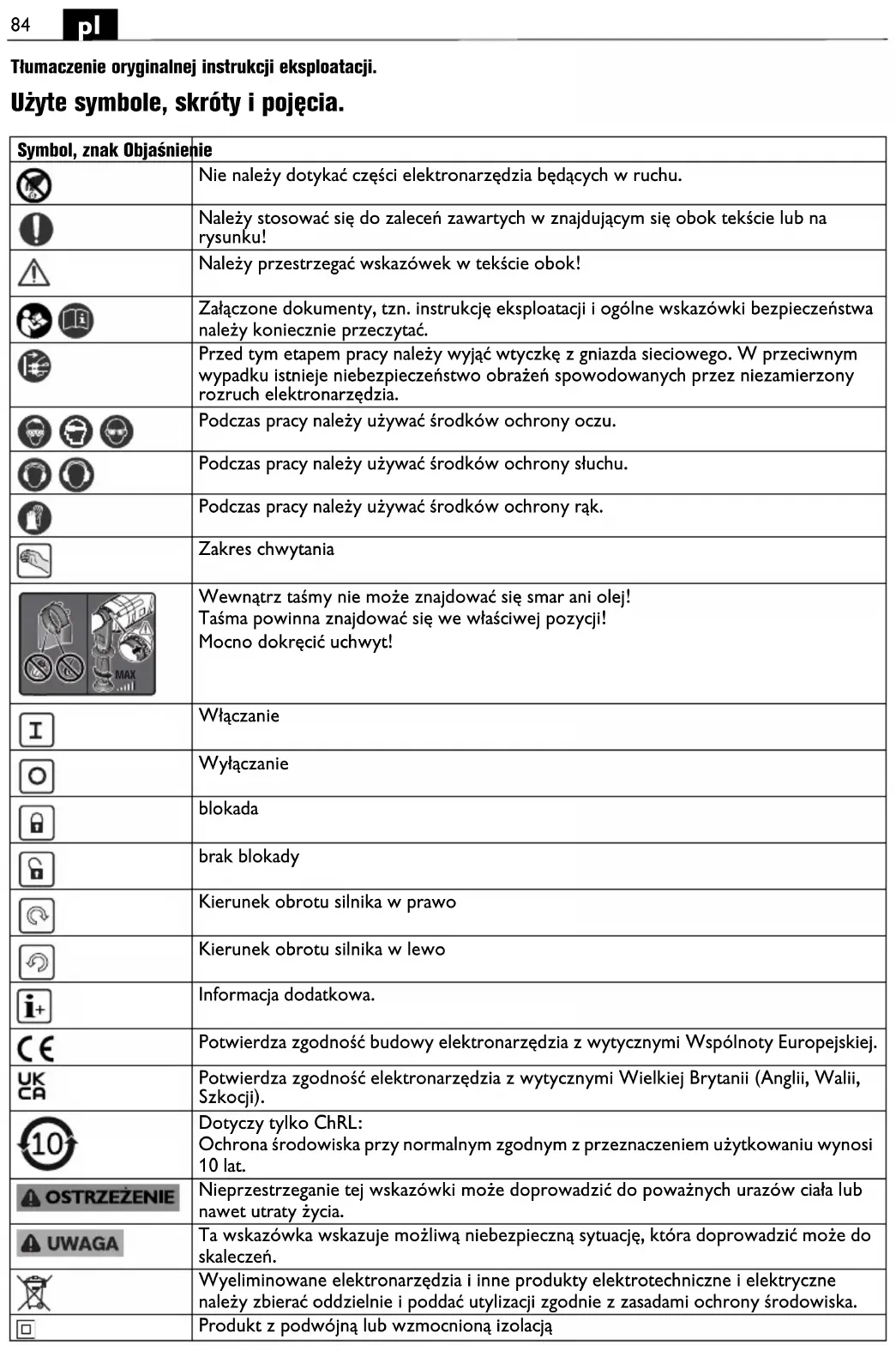 Tłumaczenie oryginalnej instrukcji eksploatacji. Użyte symbole, skróty i pojęcia. Symbol, znak Objaśnienie Nie należy dotykać części elektronarzędzia będących w ruchu. Należy stosować się do zaleceń zawartych w znajdującym się obok tekście lub na rysunku! Należy przestrzegać wskazówek w tekście obok! Załączone dokumenty, tzn. instrukcję eksploatacji i ogólne wskazówki bezpieczeństwa należy koniecznie przeczytać. Przed tym etapem pracy należy wyjąć wtyczkę z gniazda sieciowego. W przeciwnym wypadku istnieje niebezpieczeństwo obrażeń spowodowanych przez niezamierzony rozruch elektronarzędzia. Podczas pracy należy używać środków ochrony oczu. Podczas pracy należy używać środków ochrony słuchu. Podczas pracy należy używać środków ochrony rąk. Zakres chwytania Wewnątrz taśmy nie może znajdować się smar ani olej! Taśma powinna znajdować się we właściwej pozycji! Mocno dokręcić uchwyt! Włączanie Wyłączanie blokada brak blokady Kierunek obrotu silnika w prawo Kierunek obrotu silnika w lewo Informacja dodatkowa. Potwierdza zgodność budowy elektronarzędzia z wytycznymi Wspólnoty Europejskiej. Potwierdza zgodność elektronarzędzia z wytycznymi Wielkiej Brytanii (Anglii, Walii, Szkocji). Dotyczy tylko ChRL: Ochrona środowiska przy normalnym zgodnym z przeznaczeniem użytkowaniu wynosi 10 lat. Nieprzestrzeganie tej wskazówki może doprowadzić do poważnych urazów ciała lub nawet utraty życia. Ta wskazówka wskazuje możliwą niebezpieczną sytuację, która doprowadzić może do skaleczeń. Wyeliminowane elektronarzędzia i inne produkty elektrotechniczne i elektryczne należy zbierać oddzielnie i poddać utylizacji zgodnie z zasadami ochrony środowiska. Produkt z podwójną lub wzmocnioną izolacją MAX85