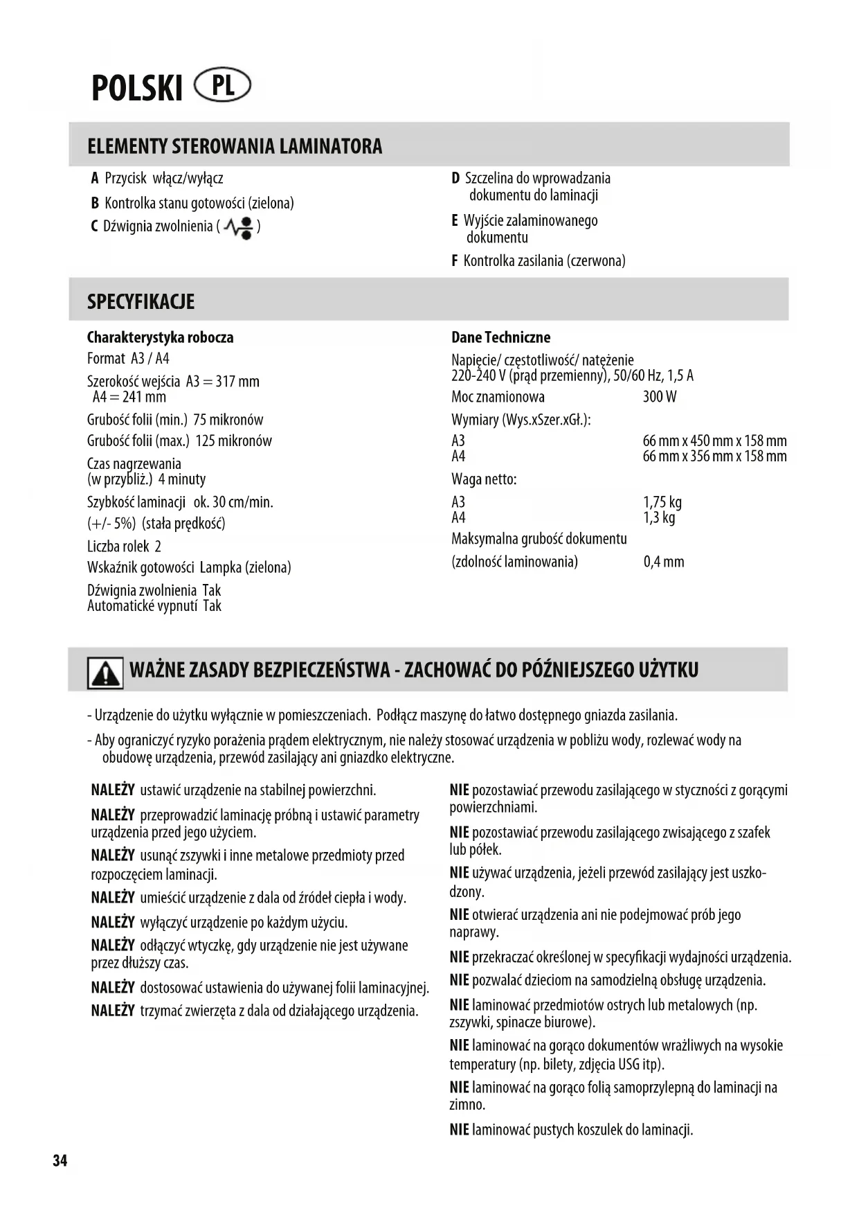 D Szczelina do wprowadzania dokumentu do laminacji E Wyjście zalaminowanego dokumentu F Kontrolka zasilania (czerwona) SPECYFIKACJE - Urządzenie do użytku wyłącznie w pomieszczeniach. Podłącz maszynę do łatwo dostępnego gniazda zasilania. - Aby ograniczyć ryzyko porażenia prądem elektrycznym, nie należy stosować urządzenia w pobliżu wody, rozlewać wody na obudowę urządzenia, przewód zasilający ani gniazdko elektryczne. NALEŻY ustawić urządzenie na stabilnej powierzchni. NALEŻY przeprowadzić laminację próbną i ustawić parametry urządzenia przed jego użyciem. NALEŻY usunąć zszywki i inne metalowe przedmioty przed rozpoczęciem laminacji. NALEŻY umieścić urządzenie z dala od źródeł ciepła i wody. NALEŻY wyłączyć urządzenie po każdym użyciu. NALEŻY odłączyć wtyczkę, gdy urządzenie nie jest używane przez dłuższy czas. NALEŻY dostosować ustawienia do używanej folii laminacyjnej. NALEŻY trzymać zwierzęta z dala od działającego urządzenia. NIE pozostawiać przewodu zasilającego w styczności z gorącymi powierzchniami. NIE pozostawiać przewodu zasilającego zwisającego z szafek lub półek. NIE używać urządzenia, jeżeli przewód zasilający jest uszko- dzony. NIE otwierać urządzenia ani nie podejmować prób jego naprawy. NIE przekraczać określonej w specykacji wydajności urządzenia. NIE pozwalać dzieciom na samodzielną obsługę urządzenia. NIE laminować przedmiotów ostrych lub metalowych (np. zszywki, spinacze biurowe). NIE laminować na gorąco dokumentów wrażliwych na wysokie temperatury (np. bilety, zdjęcia USG itp). NIE laminować na gorąco folią samoprzylepną do laminacji na zimno. NIE laminować pustych koszulek do laminacji. POLSKI