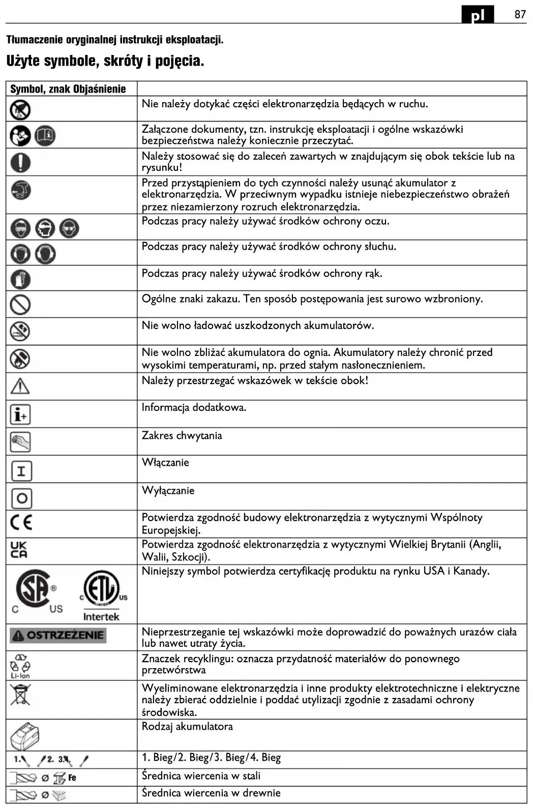 Tłumaczenie oryginalnej instrukcji eksploatacji. Użyte symbole, skróty i pojęcia. Symbol, znak Objaśnienie Nie należy dotykać części elektronarzędzia będących w ruchu. Załączone dokumenty, tzn. instrukcję eksploatacji i ogólne wskazówki bezpieczeństwa należy koniecznie przeczytać. Należy stosować się do zaleceń zawartych w znajdującym się obok tekście lub na rysunku! Przed przystąpieniem do tych czynności należy usunąć akumulator z elektronarzędzia. W przeciwnym wypadku istnieje niebezpieczeństwo obrażeń przez niezamierzony rozruch elektronarzędzia. Podczas pracy należy używać środków ochrony oczu. Podczas pracy należy używać środków ochrony słuchu. Podczas pracy należy używać środków ochrony rąk. Ogólne znaki zakazu. Ten sposób postępowania jest surowo wzbroniony. Nie wolno ładować uszkodzonych akumulatorów. Nie wolno zbliżać akumulatora do ognia. Akumulatory należy chronić przed wysokimi temperaturami, np. przed stałym nasłonecznieniem. Należy przestrzegać wskazówek w tekście obok! Informacja dodatkowa. Zakres chwytania Włączanie Wyłączanie Potwierdza zgodność budowy elektronarzędzia z wytycznymi Wspólnoty Europejskiej. Potwierdza zgodność elektronarzędzia z wytycznymi Wielkiej Brytanii (Anglii, Walii, Szkocji). Niniejszy symbol potwierdza certyfikację produktu na rynku USA i Kanady. Nieprzestrzeganie tej wskazówki może doprowadzić do poważnych urazów ciała lub nawet utraty życia. Znaczek recyklingu: oznacza przydatność materiałów do ponownego przetwórstwa Wyeliminowane elektronarzędzia i inne produkty elektrotechniczne i elektryczne należy zbierać oddzielnie i poddać utylizacji zgodnie z zasadami ochrony środowiska. Rodzaj akumulatora