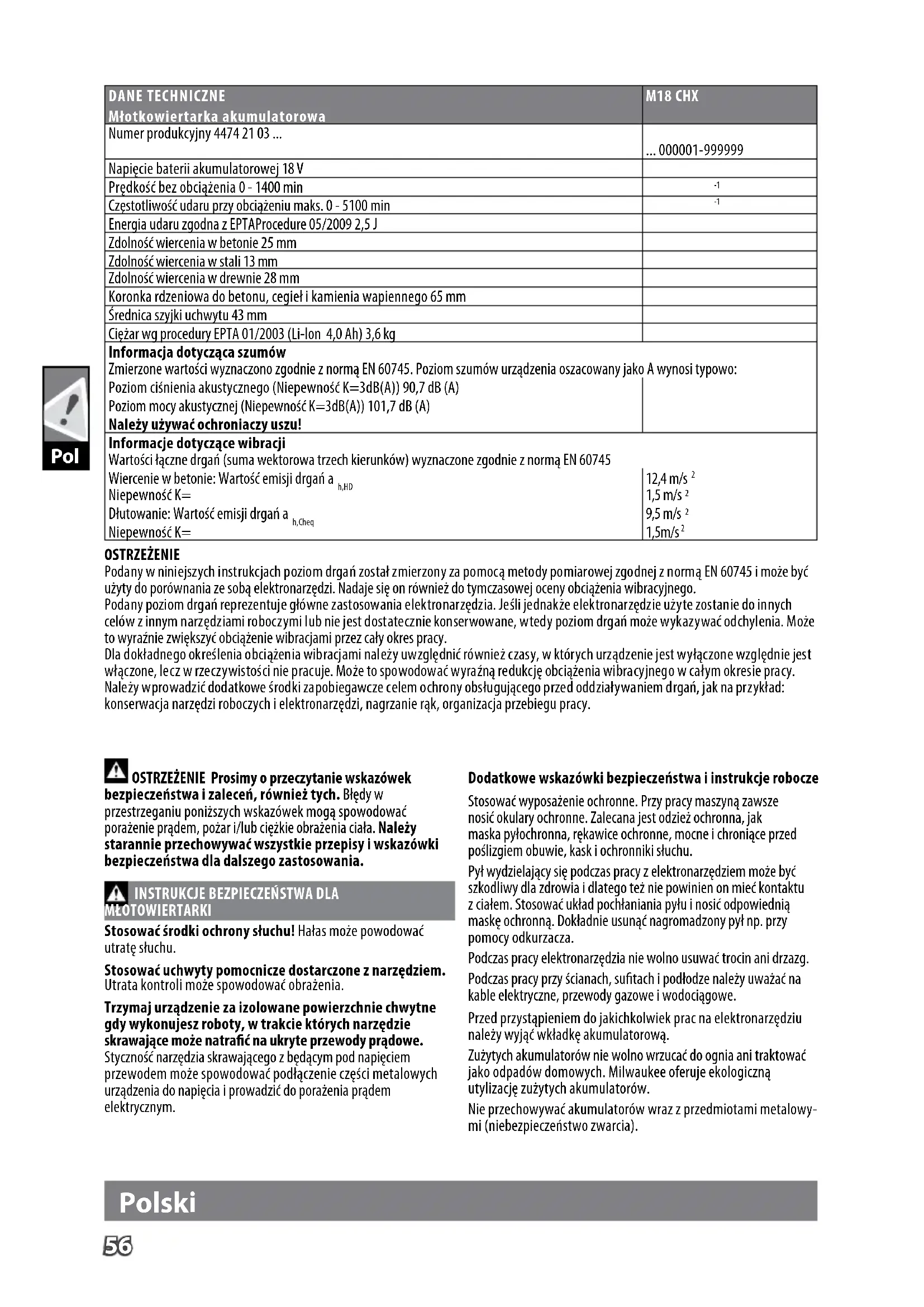 Energia udaru zgodna z EPTAProcedure 05/2009 2,5 J Zdolność wiercenia w betonie 25 mm Zdolność wiercenia w stali 13 mm Zdolność wiercenia w drewnie 28 mm Koronka rdzeniowa do betonu, cegieł i kamienia wapiennego 65 mm Średnica szyjki uchwytu 43 mm Ciężar wg procedury EPTA 01/2003 (Li-lon 4,0 Ah) 3,6 kg Informacja dotycząca szumów Zmierzone wartości wyznaczono zgodnie z normą EN 60745. Poziom szumów urządzenia oszacowany jako A wynosi typowo: Poziom ciśnienia akustycznego (Niepewność K=3dB(A)) 90,7 dB (A) Poziom mocy akustycznej (Niepewność K=3dB(A)) 101,7 dB (A) Należy używać ochroniaczy uszu! Informacje dotyczące wibracji Wartości łączne drgań (suma wektorowa trzech kierunków) wyznaczone zgodnie z normą EN 60745 Wiercenie w betonie: Wartość emisji drgań a h,HD Niepewność K= 12,4 m/s
