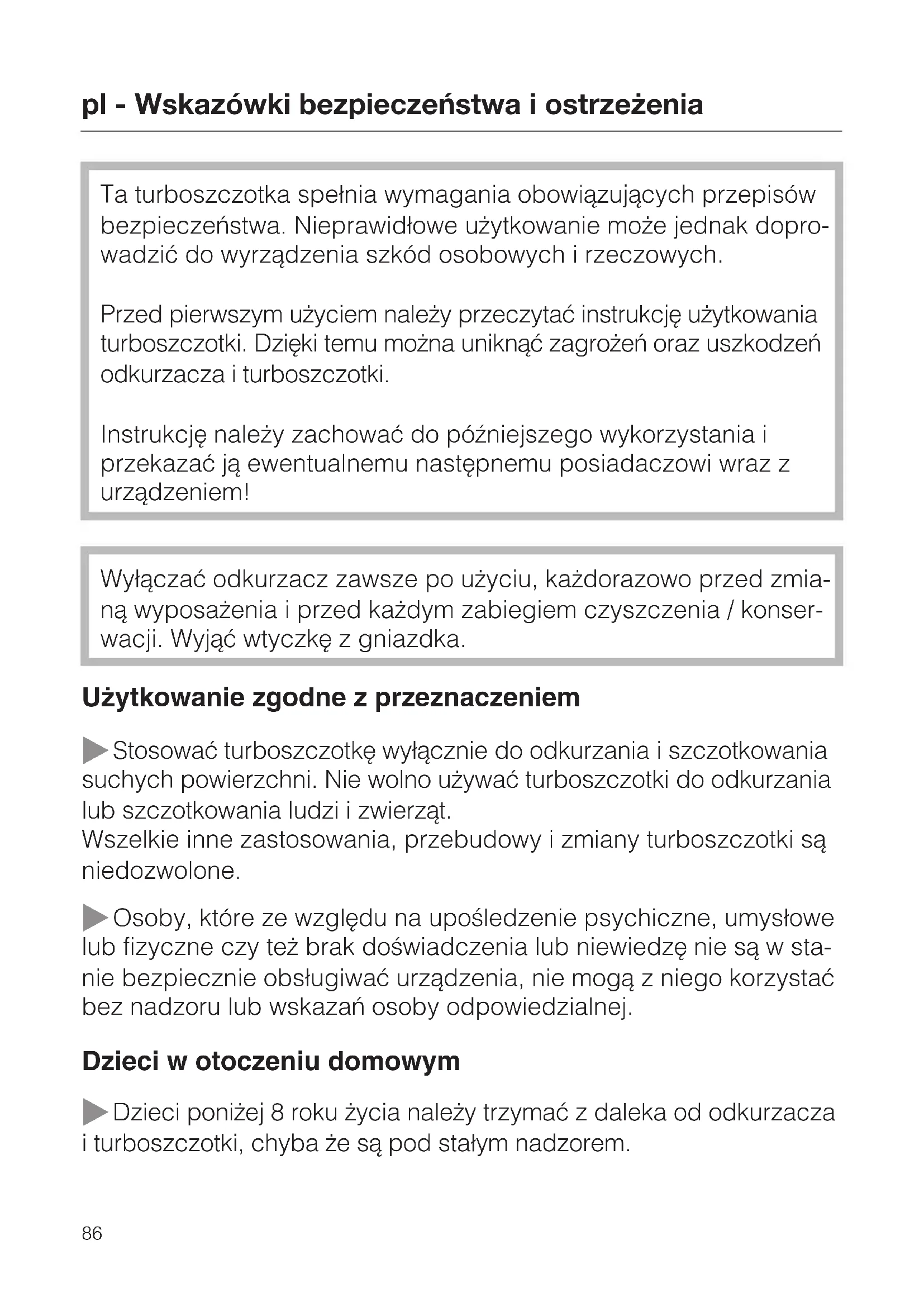 Stosowaæ turboszczotkê wy³¹cznie do odkurzania i szczotkowania suchych powierzchni. Nie wolno u¿ywaæ turboszczotki do odkurzania lub szczotkowania ludzi i zwierz¹t. Wszelkie inne zastosowania, przebudowy i zmiany turboszczotki s¹ niedozwolone.