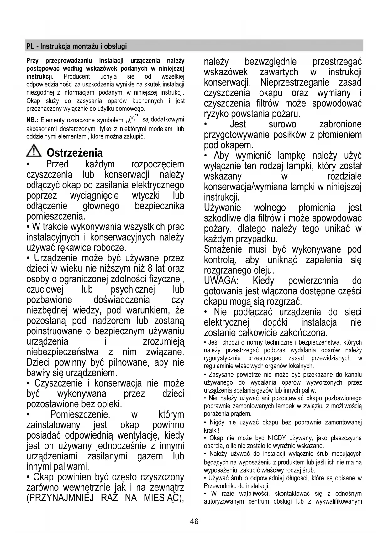 - Okap powinien być często czyszczony zarówno wewnętrznie jak i na zewnątrz (PRZYNAJMNIEJ RAZ NA MIESIĄC), należy bezwzględnie przestrzegać wskazówek zawartych w instrukcji konserwacji. Nieprzestrzeganie zasad czyszczenia okapu oraz wymiany i czyszczenia filtrów może spowodować ryzyko powstania pożaru.