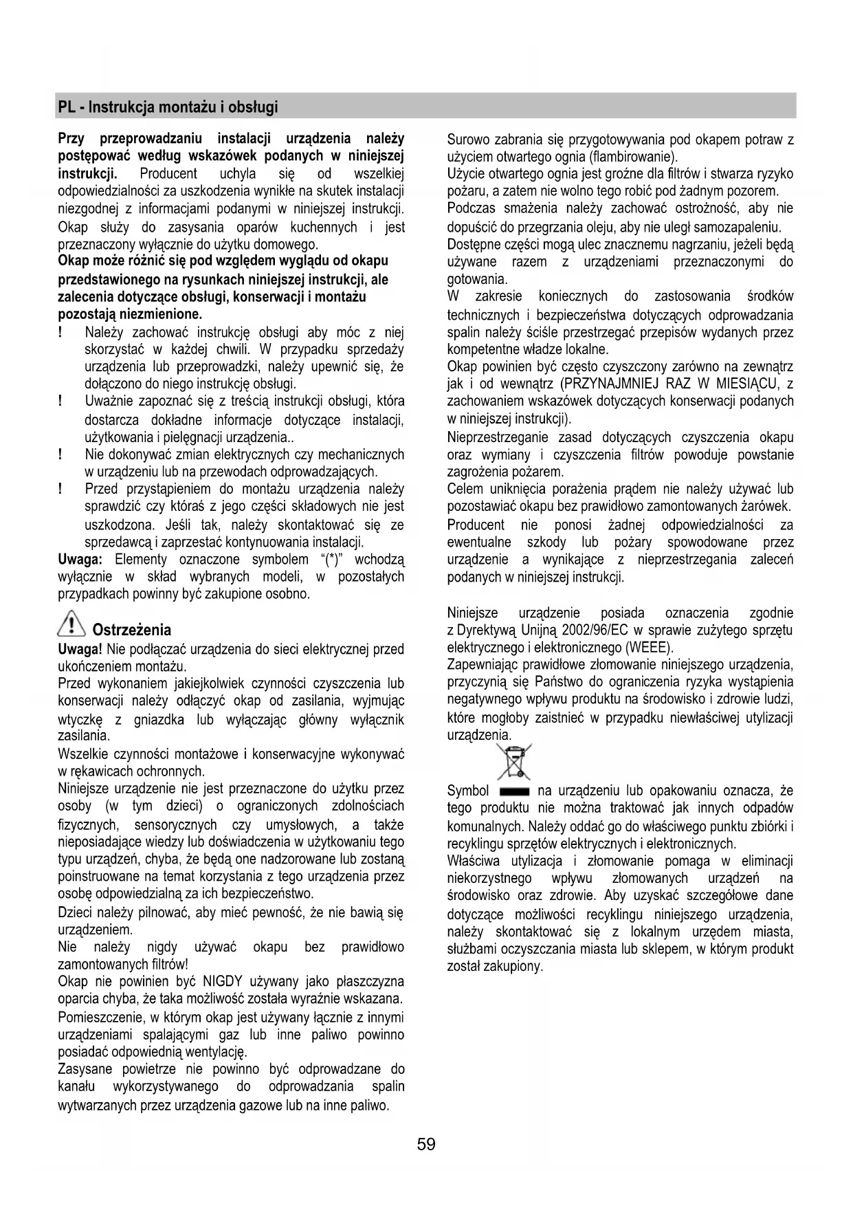 Hvis belysningen ikke fungerer, skal man kontrollere, at lampen er korrekt indsat i fatningen, før der rettes henvendelse til et servicecenter. - Model med LED pærer Emhætten er udstyret med et belysningssystem baseret på lysdiode-teknologi. Lysdioderne sikrer optimal belysning, holdbarhed op til 10 gange længere end almindelige pærer, og de giver mulighed for at spare 90% elektricitet. Ved udskiftning bedes man kontakte den tekniske servicetjeneste.59 PL - Instrukcja montażu i obsługi Przy przeprowadzaniu instalacji urządzenia należy postępować według wskazówek podanych w niniejszej instrukcji. Producent uchyla się od wszelkiej odpowiedzialności za uszkodzenia wynikłe na skutek instalacji niezgodnej z informacjami podanymi w niniejszej instrukcji. Okap służy do zasysania oparów kuchennych i jest przeznaczony wyłącznie do użytku domowego. Okap może różnić się pod względem wyglądu od okapu przedstawionego na rysunkach niniejszej instrukcji, ale zalecenia dotyczące obsługi, konserwacji i montażu pozostają niezmienione. ! Należy zachować instrukcję obsługi aby móc z niej skorzystać w każdej chwili. W przypadku sprzedaży urządzenia lub przeprowadzki, należy upewnić się, że dołączono do niego instrukcję obsługi. ! Uważnie zapoznać się z treś cią instrukcji obsługi, która dostarcza dokładne informacje dotyczące instalacji, użytkowania i pielęgnacji urządzenia.. ! Nie dokonywać zmian elektrycznych czy mechanicznych w urządzeniu lub na przewodach odprowadzających. ! Przed przystąpieniem do montażu urządzenia należy sprawdzić czy któraś z jego części składowych nie jest uszkodzona. Jeśli tak, należy skontaktować się ze sprzedawcą i zaprzestać kontynuowania instalacji. Uwaga: Elementy oznaczone symbolem “(*)” wchodzą wyłącznie w skład wybranych modeli, w pozostałych przypadkach powinny być zakupione osobno. Ostrzeżenia Uwaga! Nie podłączać urządzenia do sieci elektrycznej przed ukończeniem montażu. Przed wykonaniem jakiejkolwiek czynności czyszczenia lub konserwacji należy odłączyć okap od zasilania, wyjmując wtyczkę z gniazdka lub wyłączając główny wyłącznik zasilania. Wszelkie czynności montażowe i konserwacyjne wykonywać w rękawicach ochronnych. Niniejsze urządzenie nie jest przeznaczone do użytku przez osoby (w tym dzieci) o ograniczonych zdolnościach fizycznych, sensorycznych czy umysłowych, a także nieposiadające wiedzy lub doświadczenia w użytkowaniu tego typu urządzeń, chyba, że będą one nadzorowane lub zostaną poinstruowane na temat korzystania z tego urządzenia przez osobę odpowiedzialną za ich bezpieczeństwo. Dzieci należy pilnować, aby mieć pewność, że nie bawią się urządzeniem. Nie należy nigdy używać okapu bez prawidłowo zamontowanych filtrów! Okap nie powinien być NIGDY używany jako płaszczyzna oparcia chyba, że taka możliwość została wyraźnie wskazana. Pomieszczenie, w którym okap jest używany łącznie z innymi urządzeniami spalającymi gaz lub inne paliwo powinno posiadać odpowiednią wentylację. Zasysane powietrze nie powinno być odprowadzane do kanału wykorzystywanego do odprowadzania spalin wytwarzanych przez urządzenia gazowe lub na inne paliwo. Surowo zabrania się przygotowywania pod okapem potraw z użyciem otwartego ognia (flambirowanie). Użycie otwartego ognia jest groźne dla filtrów i stwarza ryzyko pożaru, a zatem nie wolno tego robić pod żadnym pozorem. Podczas smażenia należy zachować ostrożność, aby nie dopuścić do przegrzania oleju, aby nie uległ samozapaleniu. Dostępne części mog ą ulec znacznemu nagrzaniu, jeżeli będą używane razem z urządzeniami przeznaczonymi do gotowania. W zakresie koniecznych do zastosowania środków technicznych i bezpieczeństwa dotyczących odprowadzania spalin należy ściśle przestrzegać przepisów wydanych przez kompetentne władze lokalne. Okap powinien być często czyszczony zarówno na zewnątrz jak i od wewnątrz (PRZYNAJMNIEJ RAZ W MIESIĄCU, z zachowaniem wskazówek dotyczących konserwacji podanych w niniejszej instrukcji). Nieprzestrzeganie zasad dotyczących czyszczenia okapu oraz wymiany i czyszczenia filtrów powoduje powstanie zagrożenia pożarem. Celem uniknięcia porażenia prądem nie należy używać lub pozostawiać okapu bez prawidłowo zamontowanych żarówek. Producent nie ponosi żadnej odpowiedzialności za ewentualne szkody lub pożary spowodowane przez urządzenie a wynikające z nieprzestrzegania zaleceń podanych w niniejszej instrukcji. Niniejsze urządzenie posiada oznaczenia zgodnie z Dyrektywą Unijną 2002/96/EC w sprawie zużytego sprz ętu elektrycznego i elektronicznego (WEEE). Zapewniając prawidłowe złomowanie niniejszego urządzenia, przyczynią się Państwo do ograniczenia ryzyka wystąpienia negatywnego wpływu produktu na środowisko i zdrowie ludzi, które mogłoby zaistnieć w przypadku niewłaściwej utylizacji urządzenia. Symbol na urządzeniu lub opakowaniu oznacza, że tego produktu nie można traktować jak innych odpadów komunalnych. Należy oddać go do właściwego punktu zbiórki i recyklingu sprzętów elektrycznych i elektronicznych. Właściwa utylizacja i złomowanie pomaga w eliminacji niekorzystnego wpływu złomowanych urządzeń na środowisko oraz zdrowie. Aby uzyskać szczegółowe dane dotyczące możliwości recyklingu niniejszego urządzenia, należy skontaktować się z lokalnym urzędem miasta, służbami oczyszczania miasta lub sklepem, w którym produkt został zakupiony.60 Obsługa Urządzenie można używać jako wyciąg (odprowadzanie oparów na zewnątrz) bądź jako pochłaniacz (opary są filtrowane i odprowadzane z powrotem do pomieszczenia). Okap pracujący jako wyciąg Opary są usuwane na zewnątrz rurą odprowadzającą zamocowaną do kołnierza łączeniowego. Średnica rury odprowadzającej musi być równa średnicy kołnierza łączeniowego. Uwaga! Rura odpr