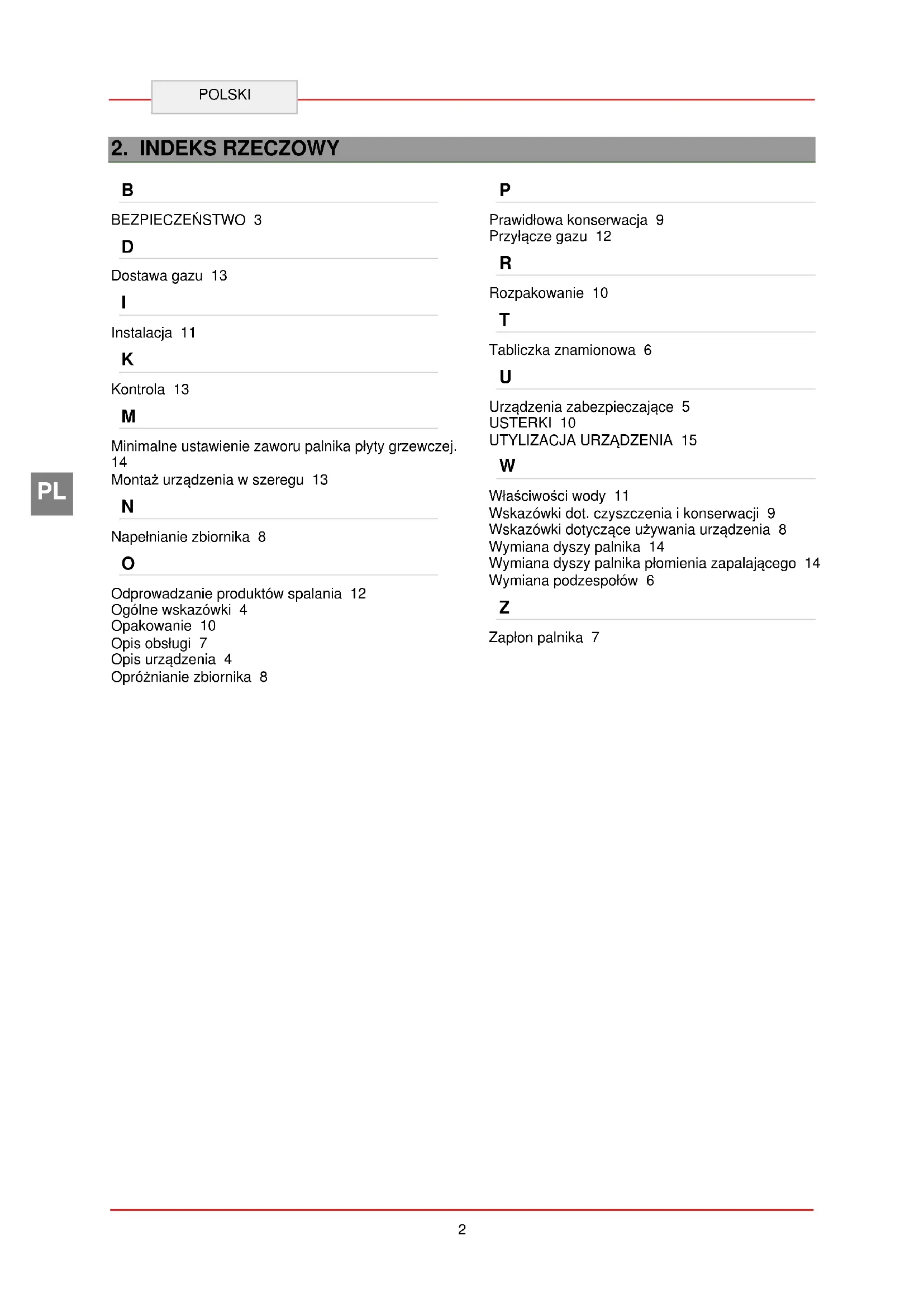 Właściwości wody 11 Wskazówki dot. czyszczenia i konserwacji 9 Wskazówki dotyczące używania urządzenia 8 Wymiana dyszy palnika 14 Wymiana dyszy palnika płomienia zapalającego 14 Wymiana podzespołów 6