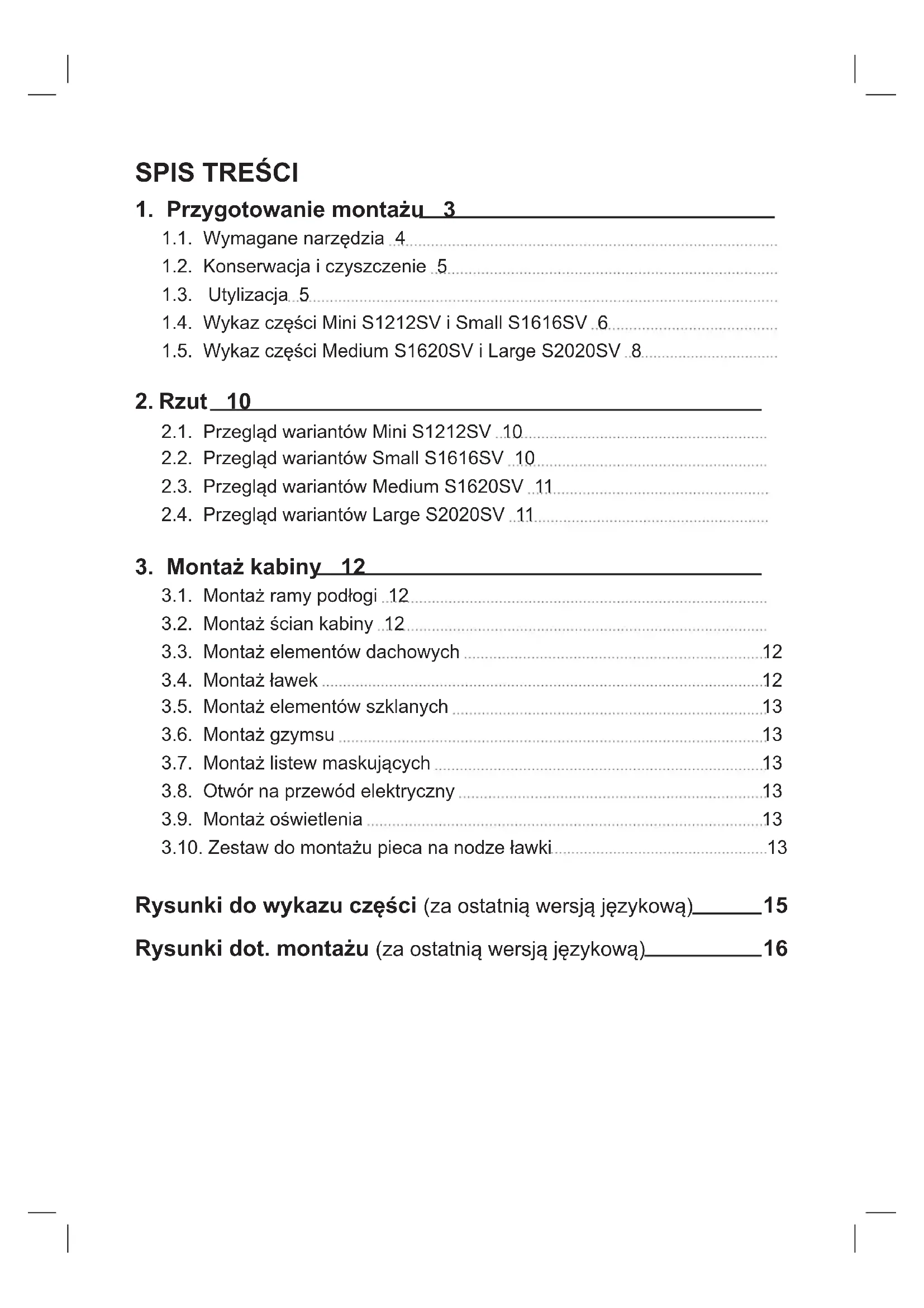 3.1. Montaż ramy podłogi 12 3.2. Montaż ścian kabiny 12 3.3. Montaż elementów dachowych 12 3.4. Montaż ławek 12 3.5. Montaż elementów szklanych 13 3.6. Montaż gzymsu 13 3.7. Montaż listew maskujących 13 3.8. Otwór na przewód elektryczny 13 3.9. Montaż oświetlenia 13 3.10. Zestaw do montażu pieca na nodze ławki 13 Rysunki do wykazu części (za ostatnią wersją językową) 15 Rysunki dot. montażu (za ostatnią wersją językową) 16PL Instrukcja montażu str. 3/14