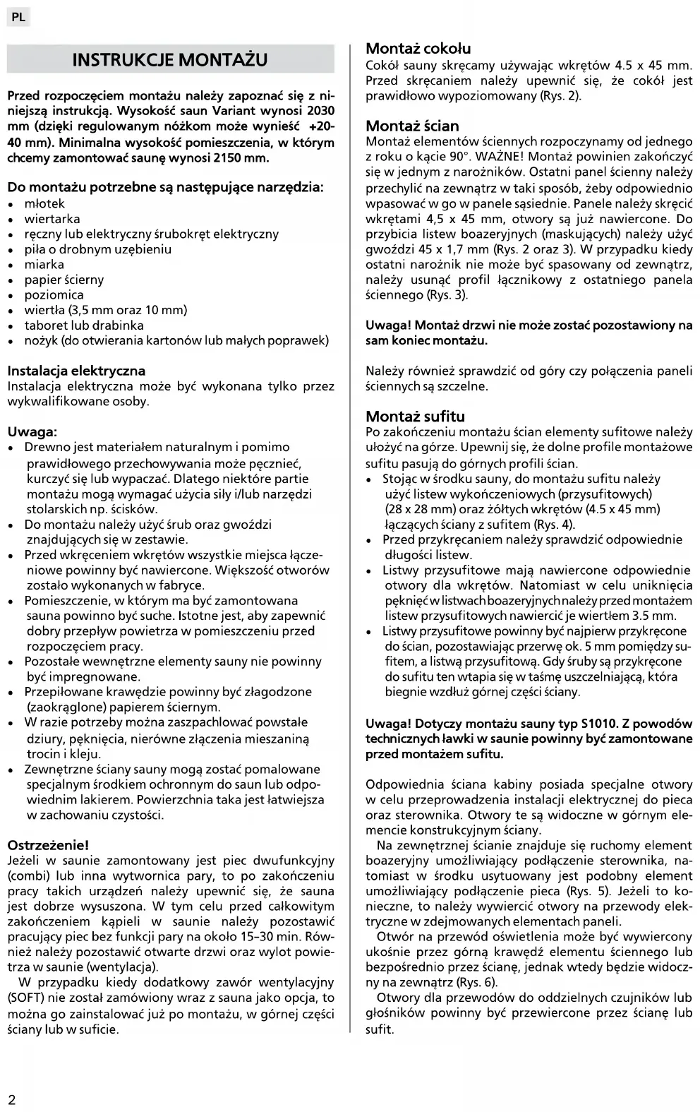 Przed rozpoczêciem monta¿u nale¿y zapoznaæ siê z ni- niejsz± instrukcj±. Wysoko¶æ saun Variant wynosi 2030 mm (dziêki regulowanym nó¿kom mo¿e wynie¶æ +20- 40 mm). Minimalna wysoko¶æ pomieszczenia, w którym chcemy zamontowaæ saunê wynosi 2150 mm. Do monta¿u potrzebne s± nastêpuj±ce narzêdzia: