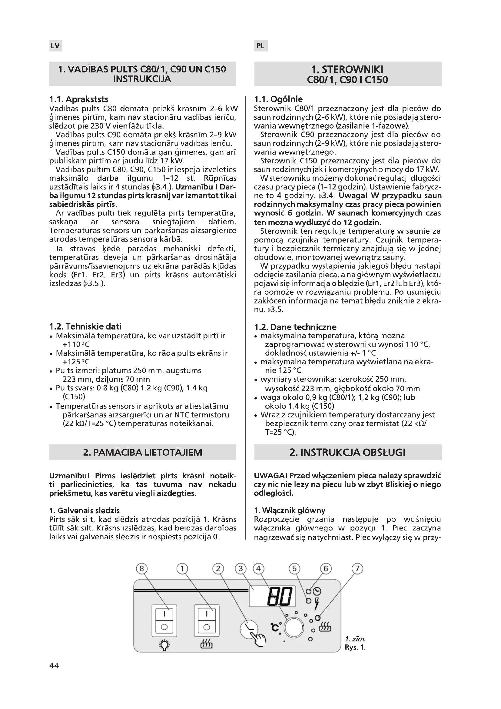 Pirts sàk silt, kad slºdzis atrodas pozïcijà 1. Kràsns tþlït sàk silt. Kràsns izslºdzas, kad beidzas darbïbas laiks vai galvenais slºdzis ir nospiests pozïcijà 0. 1.1. Ogólnie Sterownik C80/1 przeznaczony jest dla pieców do saun rodzinnych (2–6 kW), które nie posiadaj± stero- wania wewnêtrznego (zasilanie 1-fazowe). Sterownik C90 przeznaczony jest dla pieców do saun rodzinnych (2–9 kW), które nie posiadaj± stero- wania wewnêtrznego. Sterownik C150 przeznaczony jest dla pieców do saun rodzinnych jak i komercyjnych o mocy do 17 kW. W sterowniku mo¿emy dokonaæ regulacji d³ugo¶ci czasu pracy pieca (1–12 godzin). Ustawienie fabrycz- ne to 4 godziny. 3.4. Uwaga! W przypadku saun rodzinnych maksymalny czas pracy pieca powinien wynosiæ 6 godzin. W saunach komercyjnych czas ten mo¿na wyd³u¿yæ do 12 godzin. Sterownik ten reguluje temperaturê w saunie za pomoc± czujnika temperatury. Czujnik tempera- tury i bezpiecznik termiczny znajduj± siê w jednej obudowie, montowanej wewn±trz sauny. W przypadku wyst±pienia jakiego¶ b³êdu nast±pi odciêcie zasilania pieca, a na g³ównym wy¶wietlaczu pojawi siê informacja o b³êdzie (Er1, Er2 lub Er3), któ- ra pomo¿e w rozwi±zaniu problemu. Po usuniêciu zak³óceñ informacja na temat b³êdu zniknie z ekra- nu.