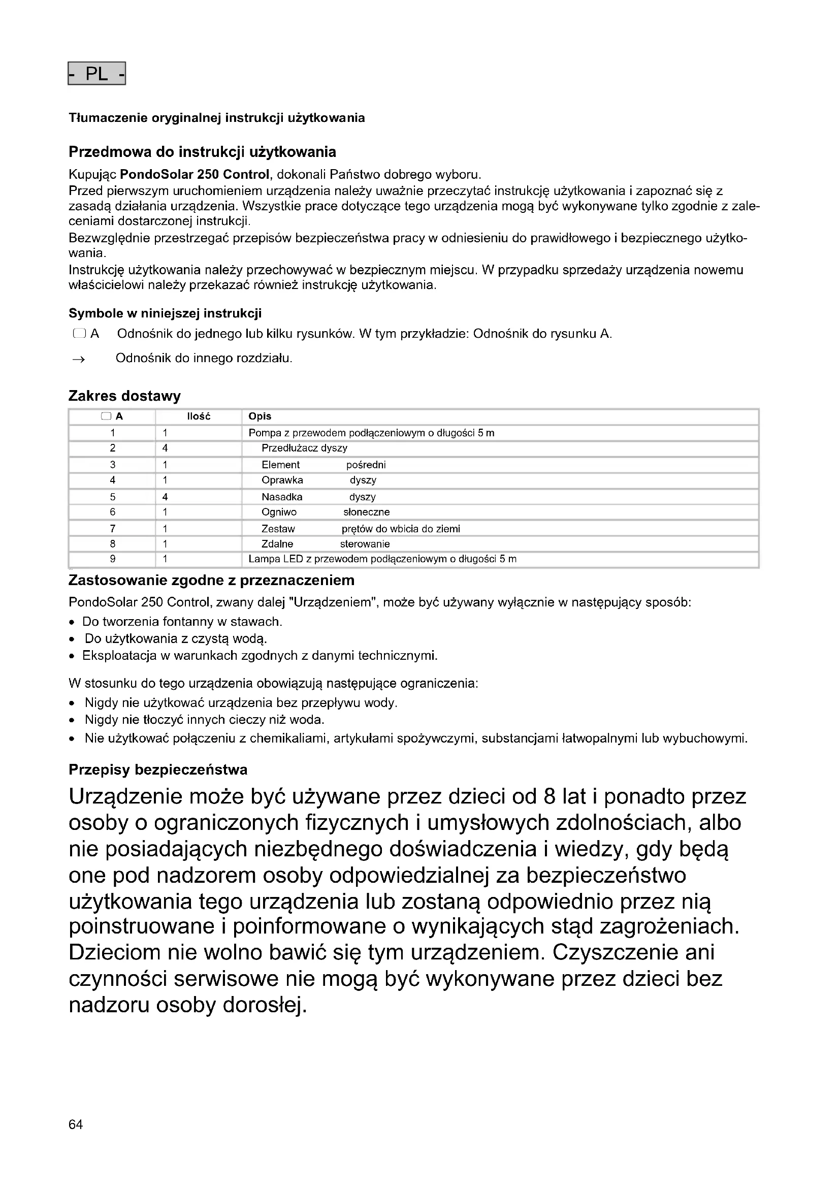 Ilość Opis 1 1 Pompa z przewodem podłączeniowym o długości 5 m 2 4 Przedłużacz dyszy 3 1 Element pośredni 4 1 Oprawka dyszy 5 4 Nasadka dyszy 6 1 Ogniwo słoneczne 7 1 Zestaw prętów do wbicia do ziemi 8 1 Zdalne sterowanie 9 1 Lampa LED z przewodem podłączeniowym o długości 5 m Zastosowanie zgodne z przeznaczeniem PondoSolar 250 Control, zwany dalej "Urządzeniem", może być używany wyłącznie w następujący sposób: Do tworzenia fontanny w stawach. Do użytkowania z czystą wodą. Eksploatacja w warunkach zgodnych z danymi technicznymi.