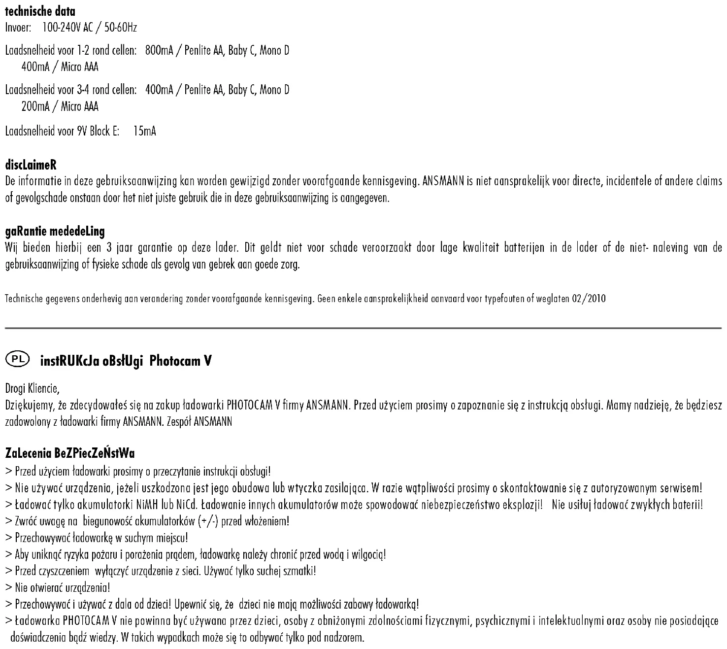 instRUKcJa oBsłUgi Photocam V Drogi Kliencie, Dziękujemy, że zdecydowałeś się na zakup ładowarki PHOTOCAM V firmy ANSMANN. Przed użyciem prosimy o zapoznanie się z instrukcją obsługi. Mamy nadzieję, że będziesz zadowolony z ładowarki firmy ANSMANN. Zespół ANSMANN ZaLecenia BeZPiecZeŃstWa > Przed użyciem ładowarki prosimy o przeczytanie instrukcji obsługi! > Nie używać urządzenia, jeżeli uszkodzona jest jego obudowa lub wtyczka zasilająca. W razie wątpliwości prosimy o skontaktowanie się z autoryzowanym serwisem! > Ładować tylko akumulatorki NiMH lub NiCd. Ładowanie innych akumulatorów może spowodować niebezpieczeństwo eksplozji! Nie usiłuj ładować zwykłych baterii! > Zwróć uwagę na biegunowość akumulatorków (+/-) przed włożeniem! > Przechowywać ładowarkę w suchym miejscu! > Aby uniknąć ryzyka pożaru i porażenia prądem, ładowarkę należy chronić przed wodą i wilgocią! > Przed czyszczeniem wyłączyć urządzenie z sieci. Używać tylko suchej szmatki! > Nie otwierać urządzenia! > Przechowywać i używać z dala od dzieci! Upewnić się, że dzieci nie mają możliwości zabawy ładowarką! > Ładowarka PHOTOCAM V nie powinna być używana przez dzieci, osoby z obniżonymi zdolnościami fizycznymi, psychicznymi i intelektualnymi oraz osoby nie posiadające doświadczenia bądź wiedzy. W takich wypadkach może się to odbywać tylko pod nadzorem.> Nie pozostawiać urządzenia podczas pracy bez kontroli! > Po użyciu odłącz ładowarkę od zasilania! > Nieprzestrzeganie instrukcji bezpieczeństwa, może doprowadzić do uszkodzenia ładowarki lub akumulatorków a nawet spowodować obrażenia! > Polecamy używanie akumulatorków firmy ANSMANN! FUNKCJE > Inteligentna ładowarka do ładowania od 1 do 4 akumulatorków NiMH / NiCd typu (R03)AAA, (R6)AA, (R14)C, (R20)D i jednego akumulatora 9V(E). > Wskaźnik naładowania LED > Indywidualne ładowanie każdego ogniwa > Zabezpieczenie przed odwrotną polaryzacją > Możliwość użytkowania na całym świecie (100-240V AC / 50-60Hz) Dla okrągłych ogniw: > Szybki test pojemności po ok. 5 sekundach od włożenia ogniw > Mikroprocesorowa kontrola ładowania > Automatyczne dostosowanie prądu ładowania > Ochrona przed przeładowaniem > Podładowywanie ogniw > Układ wykrywania uszkodzonego akumulatora / włożenia baterii alkalicznej. UŻYTKOWANIE Włącz ładowarkę do sieci elektrycznej (100-240V AC / 50 - 60Hz). 1. Ładowanie okrągłych ogniw: można ładować od 1 do 4 akumulatorków NiMH albo NiCd typu R03 (AAA), R6 (AA), R14 (C) lub R20 (D). ). Aby włożyć akumulator należy odciągnąć sprężynę do tyłu i ułożyć go na dnie urządzenia. Zawsze układać akumulatorki zgodnie z polaryzacją (znaki wewnątrz obudowy). Natychmiast po włożeniu ogniwa nastąpi pomiar jego pojemności, którego wynik będzie można zobaczyć po ok. 5 sekundach dzięki diodzie LED znajdującej się nad danym ogniwem (patrz SZYBKI TEST POJEMNOŚCI DLA OKRAGŁYCH OGNIW). Wówczas proces ładowania rozpocznie się automatycznie. Poziom naładowania akumulatorków przed umieszczeniem ich w ładowarce jest bez znaczenia. Stan ładowania każdego akumulatorka będzie widoczny dzięki poszczególnym diodom LED znajdującym się nad każdym z ogniw (patrz WSKAŹNIK ŁADOWANIA DLA OKRAGŁYCH OGNIW). Akumulatorki nie muszą być równocześnie wkładane do ładowarki, ponieważ ich procesy ładowania są niezależne. W trakcie ładowania następuje nagrzanie akumulatorów. Po zakończeniu ładowania, ładowarka automatycznie przełącza się w tryb podładowywania. 2. Ładowanie akumulatorka 9V: może być ładowany jeden akumulatorek 9V (E) wówczas gdy po jego prawej lub lewej stronie nie jest ładowany żaden akumulatorek R20 (D). Upewnij się, że akumulator 9V jest włożony zgodnie z biegunowością - według symboli na obudowie ładowarki. Wskaźnik (LED) znajdujący się nad akumulatorkiem 9V zaświeci się na czerwono gdy zostanie on poprawnie umieszczony w ładowarce. Aby uniknąć przeładowania akumulatorka 9V należy umieszczać w ładowarce tylko rozładowane akumulatory. Proszę pilnować czasu ładowania na 100mAh (patrz tabela) [1] i usunąć akumulatorek 9V z ładowarki po odpowiednim czasie ładowania. SZYBKI TEST POJEMNOŚCI DLA OKRAGŁYCH OGNIW (wynik po około 5 sekundach) Zielony LED: akumulatorek jest prawie w pełni naładowany i ładowanie nie jest konieczne Migający zielony LED: akumulatorek jest jeszcze naładowany ale można go ładować Czerwony LED : akumulatorek jest prawie rozładowany i ładowanie jest wskazane Migający czerwony LED: akumulatorek jest zupełnie rozładowany i ładowanie jest konieczneWsKaŹniK ładoWania dLa oKRĄgłYch ogniW Czerwony LED: szybkie ładowanie Zielony LED: gotowy / podładowywanie Migający czerwony LED: wadliwy akumulator lub bateria nie nadająca się do ładowania WsKaŹniK ładoWania aKUmULatoRKÓW 9V Czerwony LED: ładowanie ochRona ŚRodoWisKa Nie wyrzucaj urządzenia do normalnych odpadów domowych. Po eksploatacji proszę zwróć towar do sprzedawcy lub do najbliższego punktu recyklingu lub punktu zbiórki zużytego sprzętu elektrycznego. Prosimy również o prawidłowy recykling wszystkich materiałów opakowaniowych. Zużytych akumulatorków nie wolno wyrzucać do kosza na śmieci. Należy je oddać do punktu zbiórki lub zwrócić sprzedawcy. KonseRWacJa Dla prawidłowej pracy ładowarki styki w gniazdach przeznaczonych na akumulatory należy utrzymywać w czystości. Do czyszczenia urządzenie należy odłączyć od sieci zasilającej i używać wyłącznie suchej szmatki. dane technicZne Zasilanie: 100-240V AC / 50-60Hz Prąd ładowanie dla 1-2 okrągłych ogniw: 800mA / R6 AA, R14 C, R20 D 400mA / R03 AAA Prąd ładowania dla 3-4 okrągłych ogniw: 400mA / R6 AA, R14 C, R20 D 200mA / R03 AAA Prąd ładowania dla 9V E: 15mA UWaga Informacje zawarte w niniejszej instrukcji obsługi mogą ulec zmianie bez powiadomienia. AN