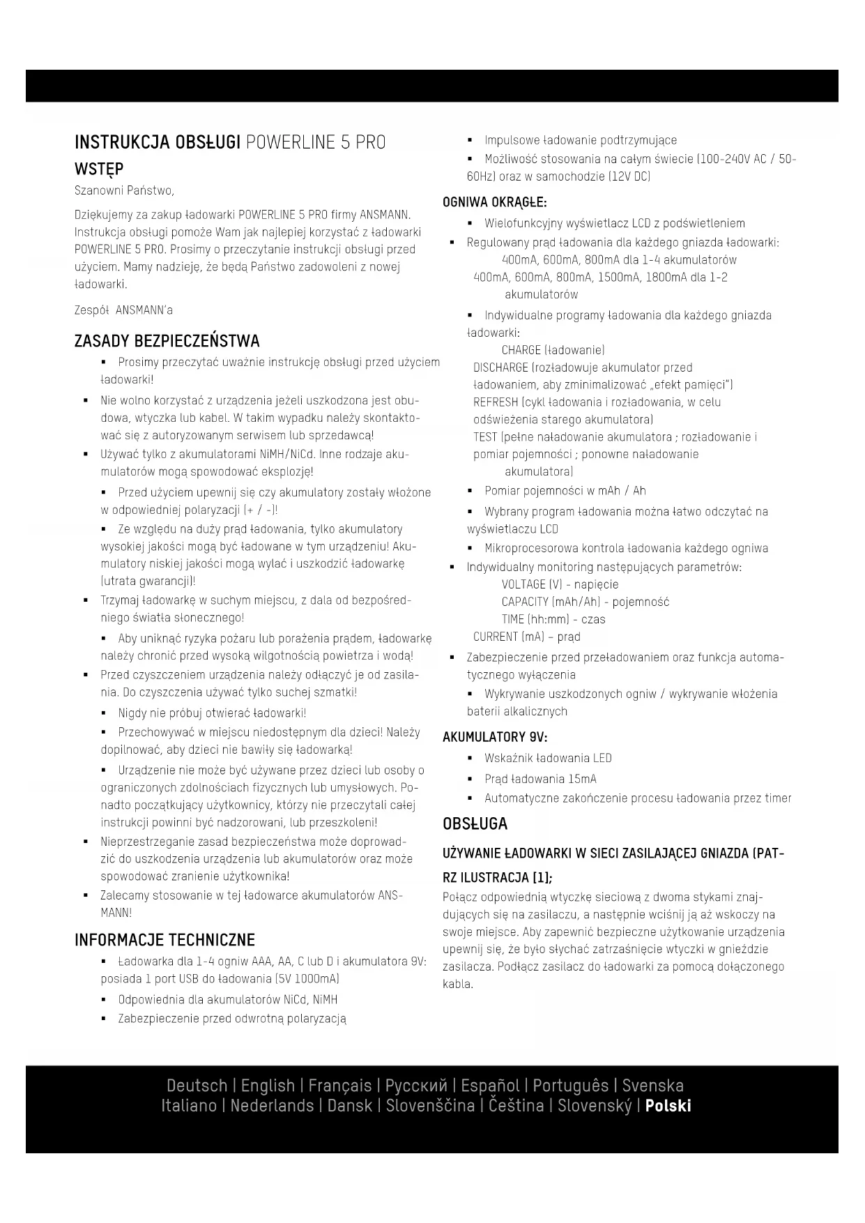 Prosimy przeczytać uważnie instrukcję obsługi przed użyciem ładowarki! Nie wolno korzystać z urządzenia jeżeli uszkodzona jest obu- dowa, wtyczka lub kabel. W takim wypadku należy skontakto- wać się z autoryzowanym serwisem lub sprzedawcą! Używać tylko z akumulatorami NiMH/NiCd. Inne rodzaje aku- mulatorów mogą spowodować eksplozję! Przed użyciem upewnij się czy akumulatory zostały włożone w odpowiedniej polaryzacji (+ / -)! Ze względu na duży prąd ładowania, tylko akumulatory wysokiej jakości mogą być ładowane w tym urządzeniu! Aku- mulatory niskiej jakości mogą wylać i uszkodzić ładowarkę (utrata gwarancji)! Trzymaj ładowarkę w suchym miejscu, z dala od bezpośred- niego światła słonecznego! Aby uniknąć ryzyka pożaru lub porażenia prądem, ładowarkę należy chronić przed wysoką wilgotnością powietrza i wodą! Przed czyszczeniem urządzenia należy odłączyć je od zasila- nia. Do czyszczenia używać tylko suchej szmatki! Nigdy nie próbuj otwierać ładowarki! Przechowywać w miejscu niedostępnym dla dzieci! Należy dopilnować, aby dzieci nie bawiły się ładowarką! Urządzenie nie może być używane przez dzieci lub osoby o ograniczonych zdolnościach fizycznych lub umysłowych. Po- nadto początkujący użytkownicy, którzy nie przeczytali całej instrukcji powinni być nadzorowani, lub przeszkoleni! Nieprzestrzeganie zasad bezpieczeństwa może doprowad- zić do uszkodzenia urządzenia lub akumulatorów oraz może spowodować zranienie użytkownika! Zalecamy stosowanie w tej ładowarce akumulatorów ANS- MANN! INFORMACJE TECHNICZNE Ładowarka dla 1-4 ogniw AAA, AA, C lub D i akumulatora 9V: posiada 1 port USB do ładowania (5V 1000mA) Odpowiednia dla akumulatorów NiCd, NiMH Zabezpieczenie przed odwrotną polaryzacją Impulsowe ładowanie podtrzymujące Możliwość stosowania na całym świecie (100-240V AC / 50- 60Hz) oraz w samochodzie (12V DC) OGNIWA OKRĄGŁE: Wielofunkcyjny wyświetlacz LCD z podświetleniem Regulowany prąd ładowania dla każdego gniazda ładowarki: 400mA, 600mA, 800mA dla 1-4 akumulatorów 400mA, 600mA, 800mA, 1500mA, 1800mA dla 1-2 akumulatorów Indywidualne programy ładowania dla każdego gniazda ładowarki: CHARGE (ładowanie) DISCHARGE (rozładowuje akumulator przed ładowaniem, aby zminimalizować „efekt pamięci“) REFRESH (cykl ładowania i rozładowania, w celu odświeżenia starego akumulatora) TEST (pełne naładowanie akumulatora ; rozładowanie i pomiar pojemności ; ponowne naładowanie akumulatora) Pomiar pojemności w mAh / Ah Wybrany program ładowania można łatwo odczytać na wyświetlaczu LCD Mikroprocesorowa kontrola ładowania każdego ogniwa Indywidualny monitoring następujących parametrów: VOLTAGE (V) - napięcie CAPACITY (mAh/Ah) - pojemność TIME (hh:mm) - czas CURRENT (mA) – prąd Zabezpieczenie przed przeładowaniem oraz funkcja automa- tycznego wyłączenia Wykrywanie uszkodzonych ogniw / wykrywanie włożenia baterii alkalicznych AKUMULATORY 9V: Wskaźnik ładowania LED Prąd ładowania 15mA Automatyczne zakończenie procesu ładowania przez timer OBSŁUGA UŻYWANIE ŁADOWARKI W SIECI ZASILAJĄCEJ GNIAZDA (PAT- RZ ILUSTRACJA [1]; Połącz odpowiednią wtyczkę sieciową z dwoma stykami znaj- dujących się na zasilaczu, a następnie wciśnij ją aż wskoczy na swoje miejsce. Aby zapewnić bezpieczne użytkowanie urządzenia upewnij się, że było słychać zatrzaśnięcie wtyczki w gnieździe zasilacza. Podłącz zasilacz do ładowarki za pomocą dołączonego kabla. Deutsch | English | Français | Pусский | Español | Português | Svenska Italiano | Nederlands | Dansk | Slovenščina | Čeština | Slovenský | PolskiNa końcu podłącz zasilacz do sieci (100-240V AC 50-60Hz). Aby zmienić wtyczkę wejściową należy wcisnąć występ blokujący po- niżej wtyczki (np. za pomocą długopisu) i wysunąć ją z gniazda. KORZYSTANIE Z ŁADOWARKI W SAMOCHODZIE; Podłącz kabel zasilacza samochodowego do ładowarki. Podłącz zasilacz samochodowy do gniazda 12VDC (12V DC) pojazdu. Upewnij się, że zasilanie z gniazda zapalniczki jest włączone. Niektóre samochody wymagają ustawienia kluczyka w odpowied- niej pozycji. Ładowarka jest teraz gotowa do użycia. Można włożyć jeden akumulator 9V i do 4 akumulatorów AA / AAA / C / D (w dowolnej kombinacji) NiMH lub NiCd. Można również podłączyć do ładowania za pomocą kabla USB do gniazda USB inne urządzenia, na przy- kład: przenośne odtwarzacze MP3, telefony komórkowe i inne. Akumulatory wkładaj zgodnie z polaryzacją oznaczoną symbolami w gnieździe ładowarki.