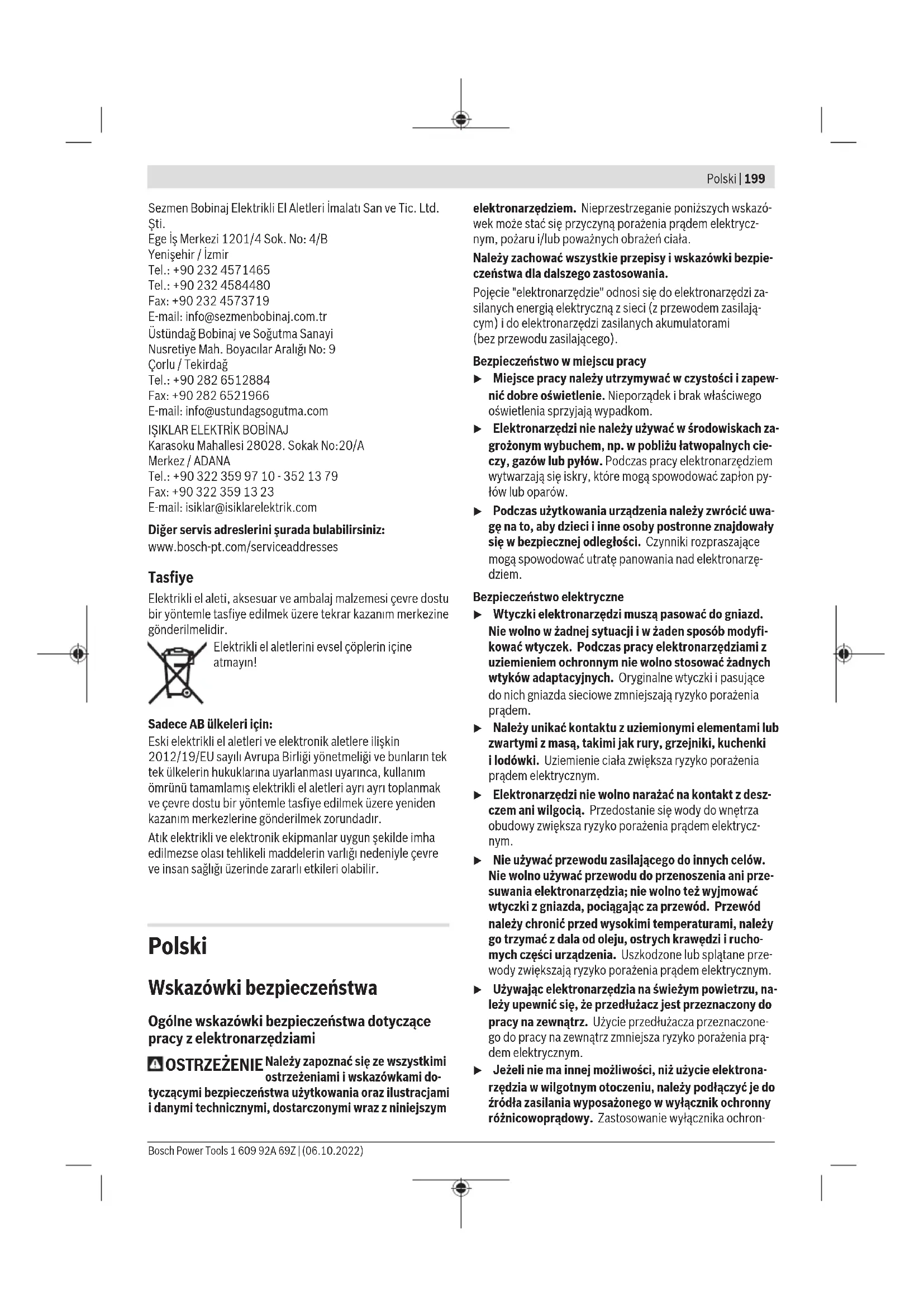 Karasoku Mahallesi 28028. Sokak No:20/A Merkez / ADANA Tel.: +903223599710 -3521379 Fax: +903223591323 E-mail: isiklar@isiklarelektrik.com Diğer servis adreslerini şurada bulabilirsiniz: www.bosch-pt.com/serviceaddresses Tasfiye Elektrikli el aleti, aksesuar ve ambalaj malzemesi çevre dostu bir yöntemle tasfiye edilmek üzere tekrar kazanım merkezine gönderilmelidir. Elektrikli el aletlerini evsel çöplerin içine atmayın! Sadece AB ülkeleri için: Eski elektrikli el aletleri ve elektronik aletlere ilişkin 2012/19/EU sayılı Avrupa Birliği yönetmeliği ve bunların tek tek ülkelerin hukuklarına uyarlanması uyarınca, kullanım ömrünü tamamlamış elektrikli el aletleri ayrı ayrı toplanmak ve çevre dostu bir yöntemle tasfiye edilmek üzere yeniden kazanım merkezlerine gönderilmek zorundadır. Atık elektrikli ve elektronik ekipmanlar uygun şekilde imha edilmezse olası tehlikeli maddelerin varlığı nedeniyle çevre ve insan sağlığı üzerinde zararlı etkileri olabilir. Polski Wskazówki bezpieczeństwa Ogólne wskazówki bezpieczeństwa dotyczące pracy z elektronarzędziami OSTRZEŻENIE Należy zapoznać się ze wszystkimi ostrzeżeniami i wskazówkami do- tyczącymi bezpieczeństwa użytkowania oraz ilustracjami i danymi technicznymi, dostarczonymi wraz z niniejszym elektronarzędziem. Nieprzestrzeganie poniższych wskazó- wek może stać się przyczyną porażenia prądem elektrycz- nym, pożaru i/lub poważnych obrażeń ciała. Należy zachować wszystkie przepisy i wskazówki bezpie- czeństwa dla dalszego zastosowania. Pojęcie "elektronarzędzie" odnosi się do elektronarzędzi za- silanych energią elektryczną z sieci (z przewodem zasilają- cym) i do elektronarzędzi zasilanych akumulatorami (bezprzewodu zasilającego). Bezpieczeństwo w miejscu pracy u Miejsce pracy należy utrzymywać w czystości i zapew- nić dobre oświetlenie. Nieporządek i brak właściwego oświetlenia sprzyjają wypadkom. u Elektronarzędzi nie należy używać w środowiskach za- grożonym wybuchem, np. w pobliżu łatwopalnych cie- czy, gazów lub pyłów. Podczas pracy elektronarzędziem wytwarzają się iskry, które mogą spowodować zapłon py- łów lub oparów. u Podczas użytkowania urządzenia należy zwrócić uwa- gę na to, aby dzieci i inne osoby postronne znajdowały się w bezpiecznej odległości. Czynniki rozpraszające mogą spowodować utratę panowania nad elektronarzę- dziem. Bezpieczeństwo elektryczne u Wtyczki elektronarzędzi muszą pasować do gniazd. Nie wolno w żadnej sytuacji i w żaden sposób modyfi- kować wtyczek. Podczas pracy elektronarzędziami z uziemieniem ochronnym nie wolno stosować żadnych wtyków adaptacyjnych. Oryginalne wtyczki i pasujące do nich gniazda sieciowe zmniejszają ryzyko porażenia prądem. u Należy unikać kontaktu z uziemionymi elementami lub zwartymi z masą, takimi jak rury, grzejniki, kuchenki ilodówki. Uziemienie ciała zwiększa ryzyko porażenia prądem elektrycznym. u Elektronarzędzi nie wolno narażać na kontakt z desz- czem ani wilgocią. Przedostanie się wody do wnętrza obudowy zwiększa ryzyko porażenia prądem elektrycz- nym. u Nie używać przewodu zasilającego do innych celów. Nie wolno używać przewodu do przenoszenia ani prze- suwania elektronarzędzia; nie wolno też wyjmować wtyczki z gniazda, pociągając za przewód. Przewód należy chronić przed wysokimi temperaturami, należy go trzymać zdala od oleju, ostrych krawędzi i rucho- mych części urządzenia. Uszkodzone lub splątane prze- wody zwiększają ryzyko porażenia prądem elektrycznym. u Używając elektronarzędzia na świeżym powietrzu, na- leży upewnić się, że przedłużacz jest przeznaczony do pracy na zewnątrz. Użycie przedłużacza przeznaczone- go do pracy na zewnątrz zmniejsza ryzyko porażenia prą- dem elektrycznym. u Jeżeli nie ma innej możliwości, niż użycie elektrona- rzędzia w wilgotnym otoczeniu, należy podłączyć je do źródła zasilania wyposażonego w wyłącznik ochronny różnicowoprądowy. Zastosowanie wyłącznika ochron- Bosch Power Tools 1 609 92A 69Z | (06.10.2022)200 | Polski nego różnicowoprądowego zmniejsza ryzyko porażenia prądem elektrycznym. Bezpieczeństwo osób u Podczas pracy z elektronarzędziem należy zachować czujność, każdą czynność wykonywać ostrożnie i z rozwagą. Nie przystępować do pracy elektronarzę- dziem w stanie zmęczenia lub będąc pod wpływem narkotyków, alkoholu lub leków. Chwila nieuwagi pod- czas pracy może grozić bardzo poważnymi obrażeniami ciała. u Stosować środki ochrony osobistej. Należy zawsze nosić okulary ochronne. Środki ochrony osobistej, np. maska przeciwpyłowa, antypoślizgowe obuwie, kask ochronny czy ochraniacze na uszy, w określonych warun- kach pracy obniżają ryzyko obrażeń ciała. u Należy unikać niezamierzonego uruchomienia narzę- dzia. Przed podłączeniem elektronarzędzia do źródła zasilania i/lub podłączeniem akumulatora, podniesie- niem albo transportem urządzenia, należy upewnić się, że włącznik elektronarzędzia znajduje się w pozy- cji wyłączonej. Przenoszenie elektronarzędzia z palcem opartym na włączniku/wyłączniku lub włożenie do gniaz- da sieciowego wtyczki włączonego narzędzia, może stać się przyczyną wypadków. u Przed włączeniem elektronarzędzia należy usunąć wszystkie narzędzia nastawcze i klucze maszynowe. Narzędzia lub klucze, pozostawione wruchomych czę- ściach urządzenia, mogą spowodować obrażenia ciała. u Należy unikać nienaturalnych pozycji przy pracy. Na- leży dbać o stabilną pozycję przy pracy i zachowanie równowagi. Dzięki temu można będzie łatwiej zapano- wać nad elektronarzędziem w nieprzewidzianych sytu- acjach. u Należy nosić odpowiednią odzież. Nie należy nosić luźnej odzieży ani biżuterii. Włosy i odzież należy trzy- mać z dala od ruchomych części. Luźna odzież, biżuteria lub długie