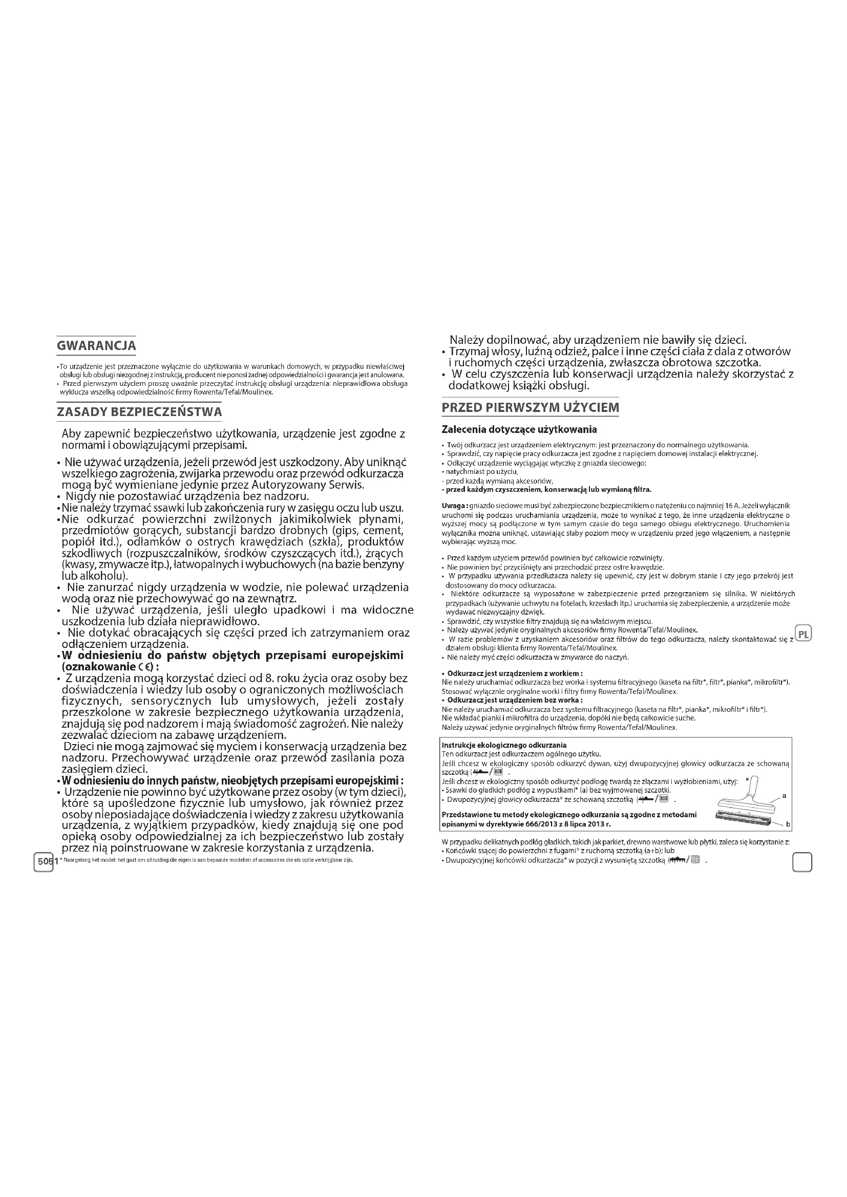 - Twój odkurzacz jest urządzeniem elektrycznym: jest przeznaczony do normalnego użytkowania.• Sprawdzić, czy napięcie pracy odkurzacza jest zgodne z napięciem domowej instalacji elektrycznej.• Odłączyć urządzenie wyciągając wtyczkę z gniazda sieciowego:- natychmiast po użyciu,- przed każdą wymianą akcesoriów,- przed każdym czyszczeniem, konserwacją lub wymianą ltra. Uwaga : gniazdo sieciowe musi być zabezpieczone bezpiecznikiem o natężeniu co najmniej 16 A. Jeżeli wyłącznik uruchomi się podczas uruchamiania urządzenia, może to wynikać z tego, że inne urządzenia elektryczne o wyższej mocy są podłączone w tym samym czasie do tego samego obiegu elektrycznego. Uruchomienia wyłącznika można uniknąć, ustawiając słaby poziom mocy w urządzeniu przed jego włączeniem, a następnie wybierając wyższą moc.• Przed każdym użyciem przewód powinien być całkowicie rozwinięty.• Nie powinien być przyciśnięty ani przechodzić przez ostre krawędzie.• W przypadku używania przedłużacza należy się upewnić, czy jest w dobrym stanie i czy jego przekrój jest dostosowany do mocy odkurzacza.• Niektóre odkurzacze są wyposażone w zabezpieczenie przed przegrzaniem się silnika. W niektórych przypadkach (używanie uchwytu na fotelach, krzesłach itp.) uruchamia się zabezpieczenie, a urządzenie może wydawać niezwyczajny dźwięk. • Sprawdzić, czy wszystkie ltry znajdują się na właściwym miejscu. • Należy używać jedynie oryginalnych akcesoriów rmy Rowenta/Tefal/Moulinex. • W razie problemów z uzyskaniem akcesoriów oraz ltrów do tego odkurzacza, należy skontaktować się z działem obsługi klienta rmy Rowenta/Tefal/Moulinex. • Nie należy myć części odkurzacza w zmywarce do naczyń.• Odkurzacz jest urządzeniem z workiem : Nie należy uruchamiać odkurzacza bez worka i systemu ltracyjnego (kaseta na ltr*, ltr*, pianka*, mikroltr*).Stosować wyłącznie oryginalne worki i ltry rmy Rowenta/Tefal/Moulinex. • Odkurzacz jest urządzeniem bez worka :Nie należy uruchamiać odkurzacza bez systemu ltracyjnego (kaseta na ltr*, pianka*, mikroltr* i ltr*).Nie wkładać pianki i mikroltra do urządzenia, dopóki nie będą całkowicie suche.Należy używać jedynie oryginalnych ltrów rmy Rowenta/Tefal/Moulinex. Instrukcje ekologicznego odkurzania Ten odkurzacz jest odkurzaczem ogólnego użytku. Jeśli chcesz w ekologiczny sposób odkurzyć dywan, użyj dwupozycyjnej głowicy odkurzacza ze schowaną szczotką ( *) Jeśli chcesz w ekologiczny sposób odkurzyć podłogę twardą ze złączami i wyżłobieniami, użyj: • Ssawki do gładkich podłóg z wypustkami* (a) bez wyjmowanej szczotki.• Dwupozycyjnej głowicy odkurzacza* ze schowaną szczotką ( *) Przedstawione tu metody ekologicznego odkurzania są zgodne z metodamiopisanymi w dyrektywie 666/2013 z 8 lipca 2013 r.W przypadku delikatnych podłóg gładkich, takich jak parkiet, drewno warstwowe lub płytki, zaleca się korzystanie z:• Końcówki ssącej do powierzchni z fugami* z ruchomą szczotką (a+b); lub • Dwupozycyjnej końcówki odkurzacza* w pozycji z wysuniętą szczotką ( *)