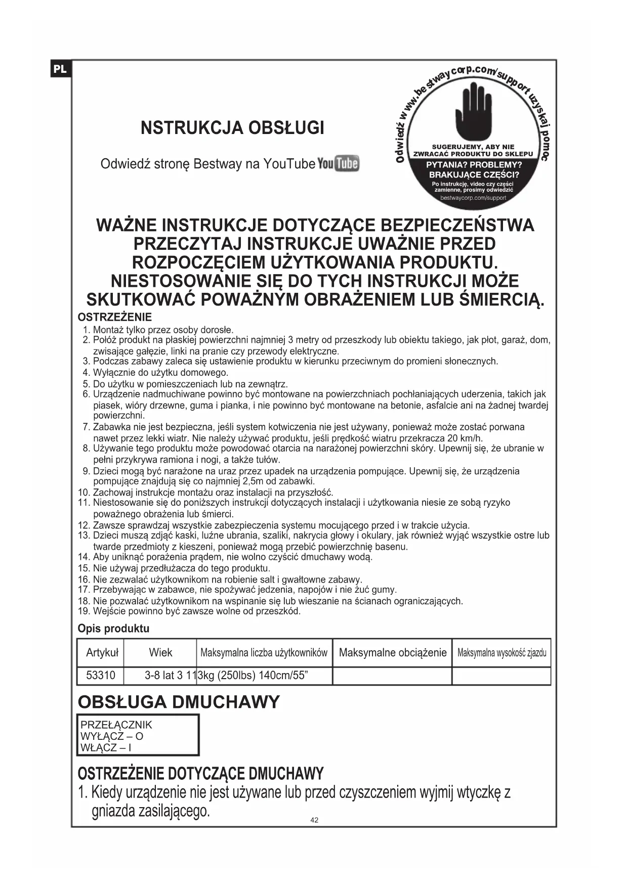OSTRZEŻENIE 1. Montaż tylko przez osoby dorosłe. 2. Połóż produkt na płaskiej powierzchni najmniej 3 metry od przeszkody lub obiektu takiego, jak płot, garaż, dom, zwisające gałęzie, linki na pranie czy przewody elektryczne. 3. Podczas zabawy zaleca się ustawienie produktu w kierunku przeciwnym do promieni słonecznych. 4. Wyłącznie do użytku domowego. 5. Do użytku w pomieszczeniach lub na zewnątrz. 6. Urządzenie nadmuchiwane powinno być montowane na powierzchniach pochłaniających uderzenia, takich jak piasek, wióry drzewne, guma i pianka, i nie powinno być montowane na betonie, asfalcie ani na żadnej twardej powierzchni. 7. Zabawka nie jest bezpieczna, jeśli system kotwiczenia nie jest używany, ponieważ może zostać porwana nawet przez lekki wiatr. Nie należy używać produktu, jeśli prędkość wiatru przekracza 20 km/h. 8. Używanie tego produktu może powodować otarcia na narażonej powierzchni skóry. Upewnij się, że ubranie w pełni przykrywa ramiona i nogi, a także tułów. 9. Dzieci mogą być narażone na uraz przez upadek na urządzenia pompujące. Upewnij się, że urządzenia pompujące znajdują się co najmniej 2,5m od zabawki.10. Zachowaj instrukcje montażu oraz instalacji na przyszłość.11. Niestosowanie się do poniższych instrukcji dotyczących instalacji i użytkowania niesie ze sobą ryzyko poważnego obrażenia lub śmierci.12. Zawsze sprawdzaj wszystkie zabezpieczenia systemu mocującego przed i w trakcie użycia.13. Dzieci muszą zdjąć kaski, luźne ubrania, szaliki, nakrycia głowy i okulary, jak również wyjąć wszystkie ostre lub twarde przedmioty z kieszeni, ponieważ mogą przebić powierzchnię basenu.14. Aby uniknąć porażenia prądem, nie wolno czyścić dmuchawy wodą.15. Nie używaj przedłużacza do tego produktu.16. Nie zezwalać użytkownikom na robienie salt i gwałtowne zabawy.17. Przebywając w zabawce, nie spożywać jedzenia, napojów i nie żuć gumy.18. Nie pozwalać użytkownikom na wspinanie się lub wieszanie na ścianach ograniczających.19. Wejście powinno być zawsze wolne od przeszkód. Opis produktu Artykuł