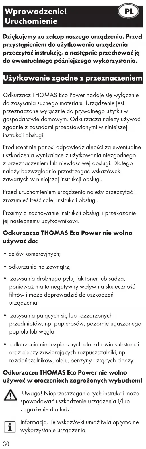 Odkurzacz THOMAS Eco Power nada sie wyłęcznych do zasysania suchego materiały. Urzędzenia jest przyznaczone wyłȩcznych do prywatnégo uzytku w gospodarstwie domowym. Odkurzacja naleź uzywać zgodnia zzasadami przystawionymi w nimiejszej instrukcji obstugi.