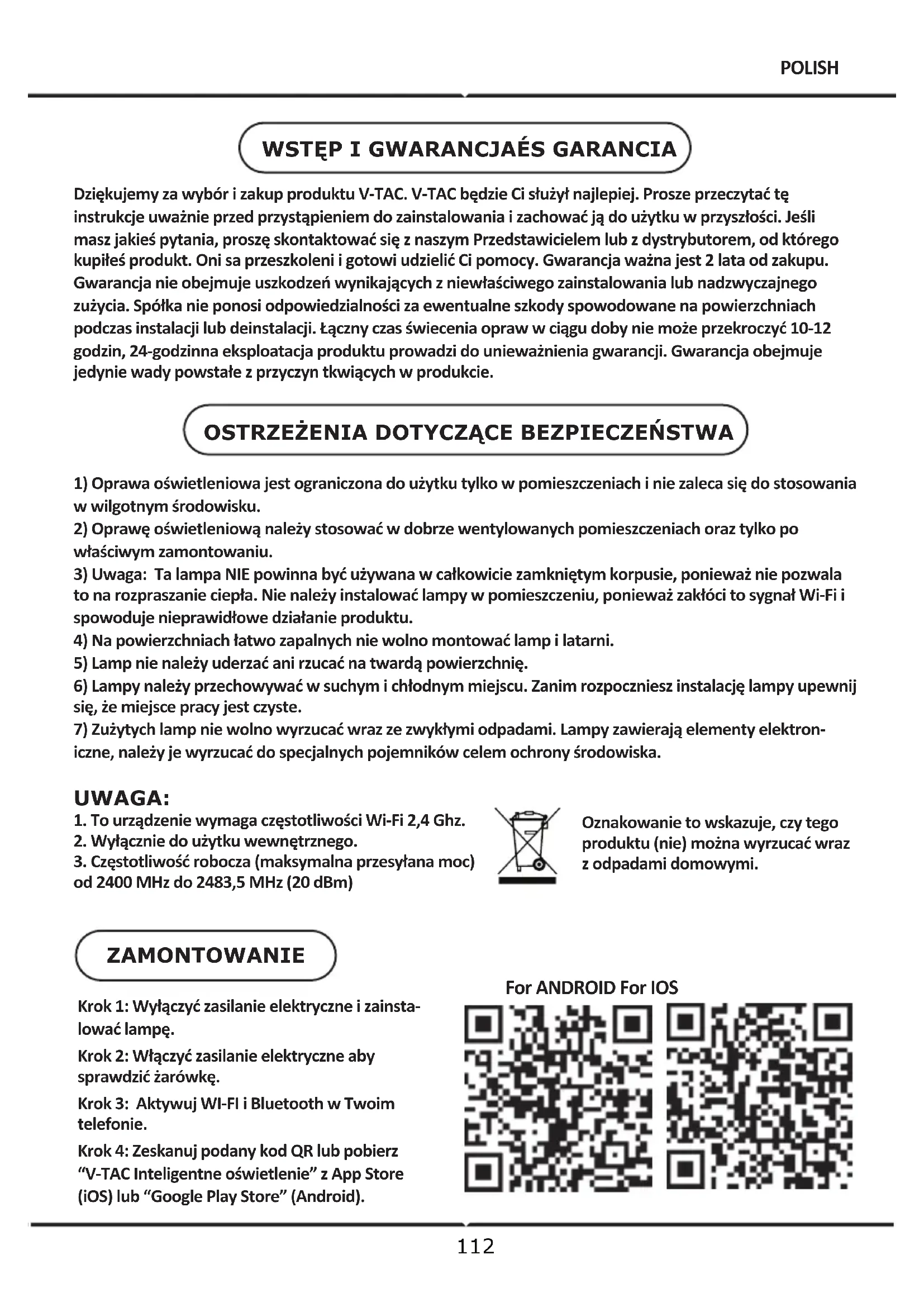 ZAMONTOWANIE Krok 1: Wyłączyć zasilanie elektryczne i zainsta- lować lampę. Krok 2: Włączyć zasilanie elektryczne aby sprawdzić żarówkę. Krok 3: Aktywuj WI-FI i Bluetooth w Twoim telefonie. Krok 4: Zeskanuj podany kod QR lub pobierz “V-TAC Inteligentne oświetlenie” z App Store (iOS) lub “Google Play Store” (Android). For ANDROID For IOS Oznakowanie to wskazuje, czy tego produktu (nie) można wyrzucać wraz z odpadami domowymi. UWAGA: