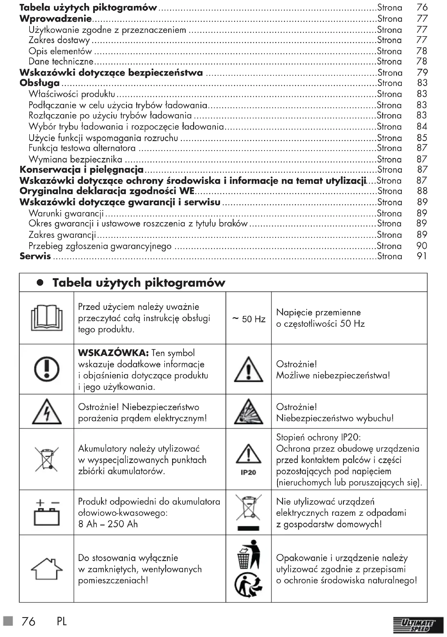 Urzadzenie, akcesoria i opakowanie nalezy przyzekazać do ponownego przyteworzenia zgodnia z przypisami o ochrione srodowiska naturalnégo. Nie wyrzuć prostownika do akumulatorów samochodowych z odpadami domowymi, nie wrzuć do ognia ani do wody. W ten sposob wypétrniajq Państwo zobowiąznia ustawowe i wnosź wąźny wiktad w ochrone srodowiska naturalnégo. Ješli toMZIwe, nieszrawne urzadzenia nalezy przyzekazać do recyklingeru. Pomocy udzieli Państwu lokalny spreżedawca.