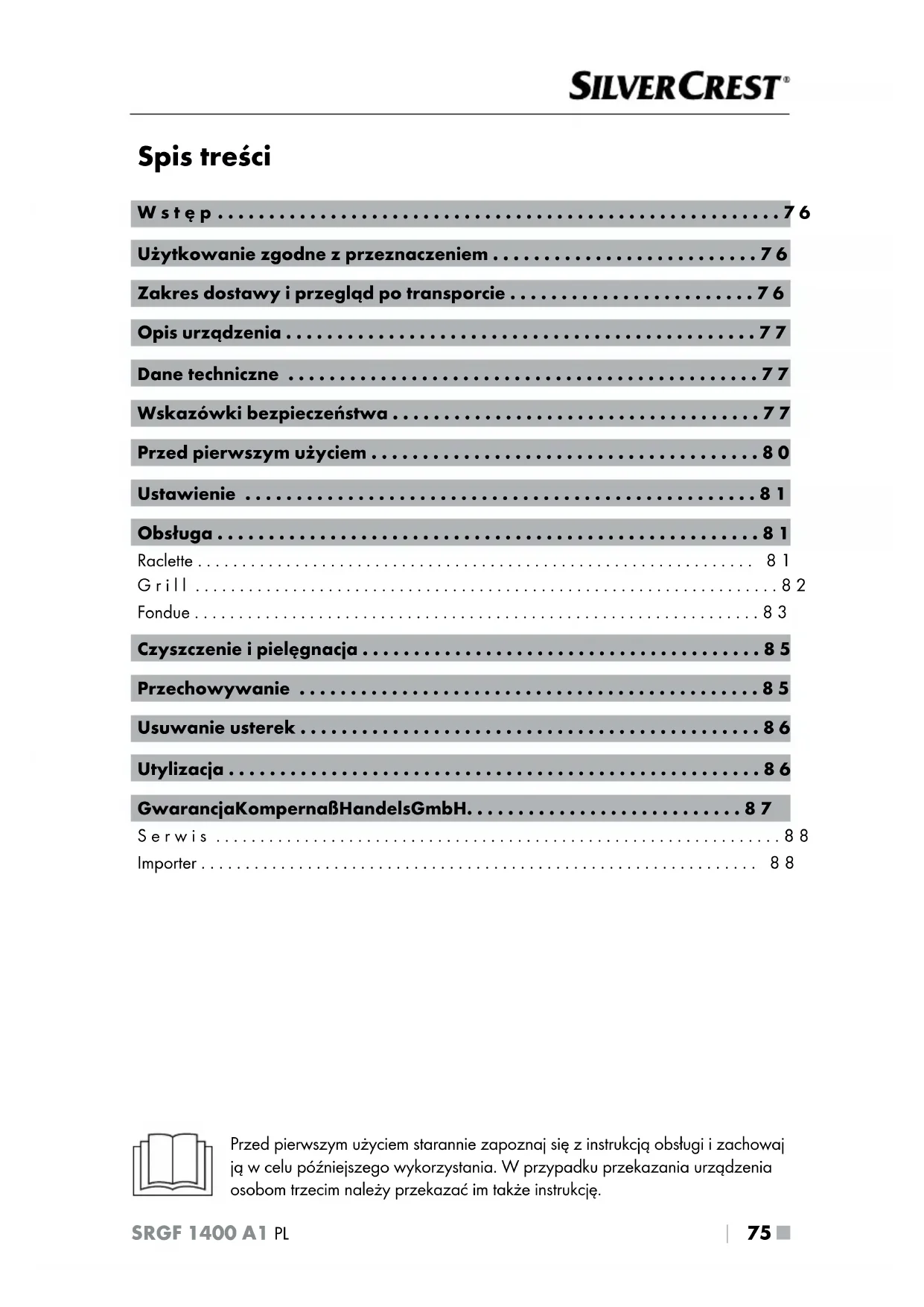 - Importer Przed pierwszym użyciem starannie zapoznaj się z instrukcją obsługi i zachowaj ją w celu późniejszego wykorzystania. Wprzypadku przekazania urządzenia osobom trzecim należy przekazać im także instrukcję.SRGF 1400 A1■ 76 p. 88