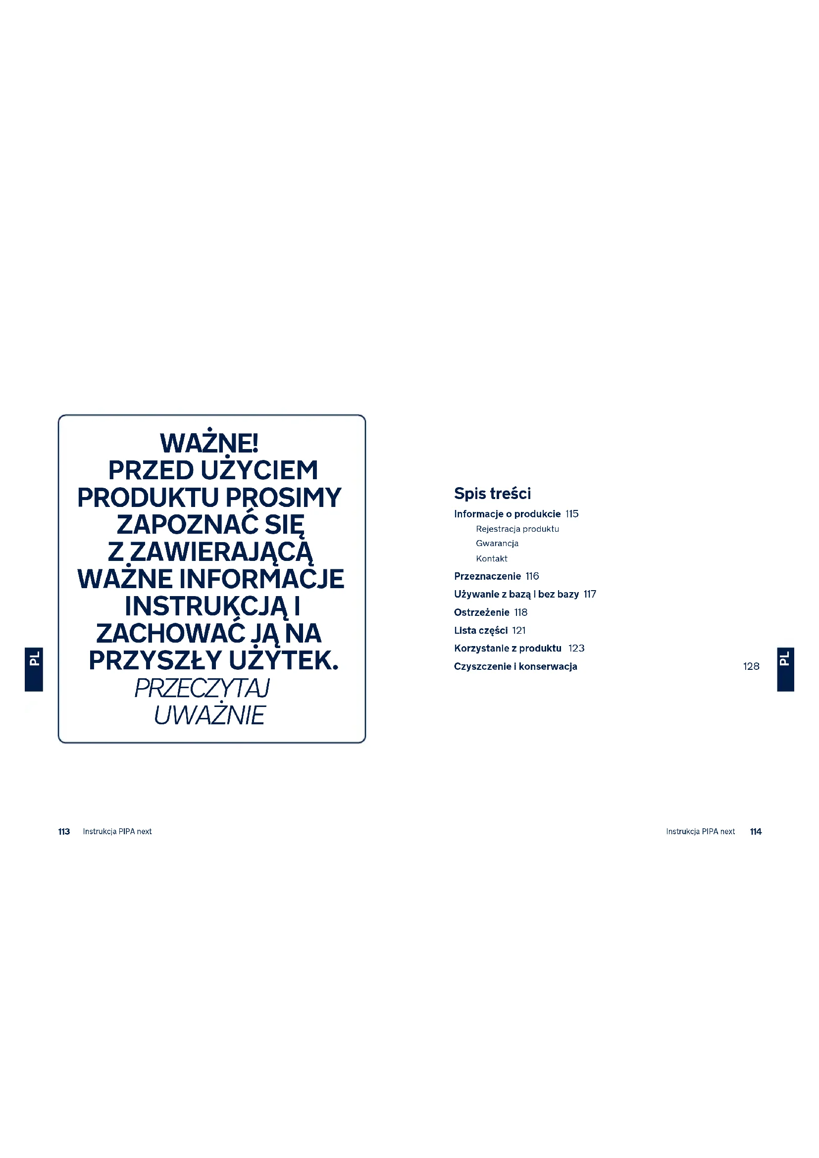 PRZYSZŁY UŻYTEK. PRZECZYTAJ UWAŻNIE Spis treści Informacje o produkcie 115 Rejestracja produktu Gwarancja Kontakt Przeznaczenie 116 Używanie z bazą i bez bazy 117 Ostrzeżenie 118 Lista części 121 Korzystanie z produktu 123 Czyszczenie i konserwacja 128