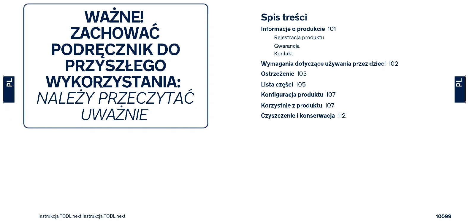 Instrukcja TODL next Instrukcja TODL next Spis treści Informacje o produkcie 101 Rejestracja produktu Gwarancja Kontakt Wymagania dotyczące używania przez dzieci 102 Ostrzeżenie 103 Lista części 105 Konfiguracja produktu 107 Korzystnie z produktu 107 Czyszczenie i konserwacja 112 WAŻNE! ZACHOWAĆ