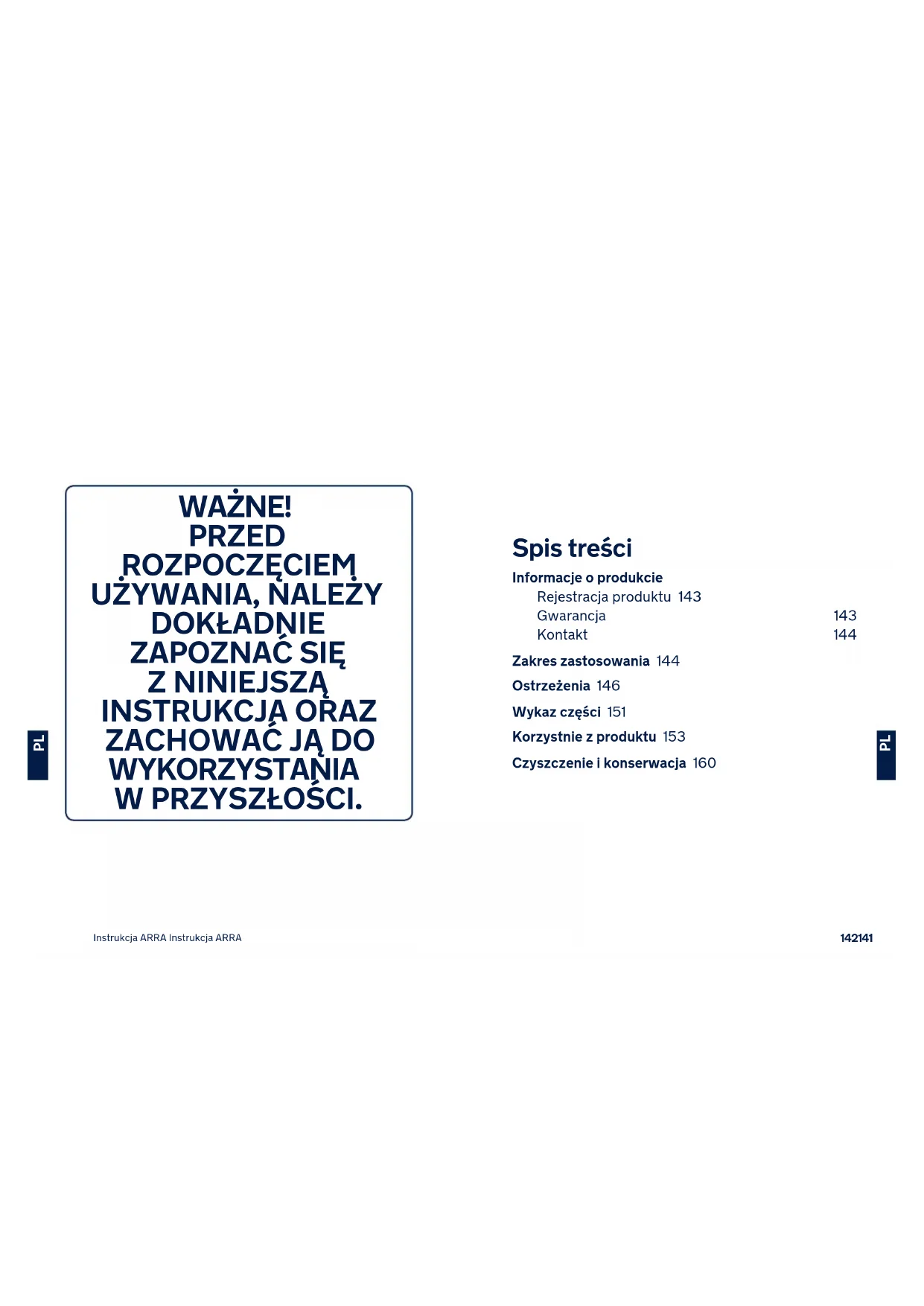 Spis treści Informacje o produkcie Rejestracja produktu 143 Gwarancja 143 Kontakt 144 Zakres zastosowania 144 Ostrzeżenia 146 Wykaz części 151 Korzystnie z produktu 153 Czyszczenie i konserwacja 160 WAŻNE﹗ PRZED ROZPOCZĘCIEM