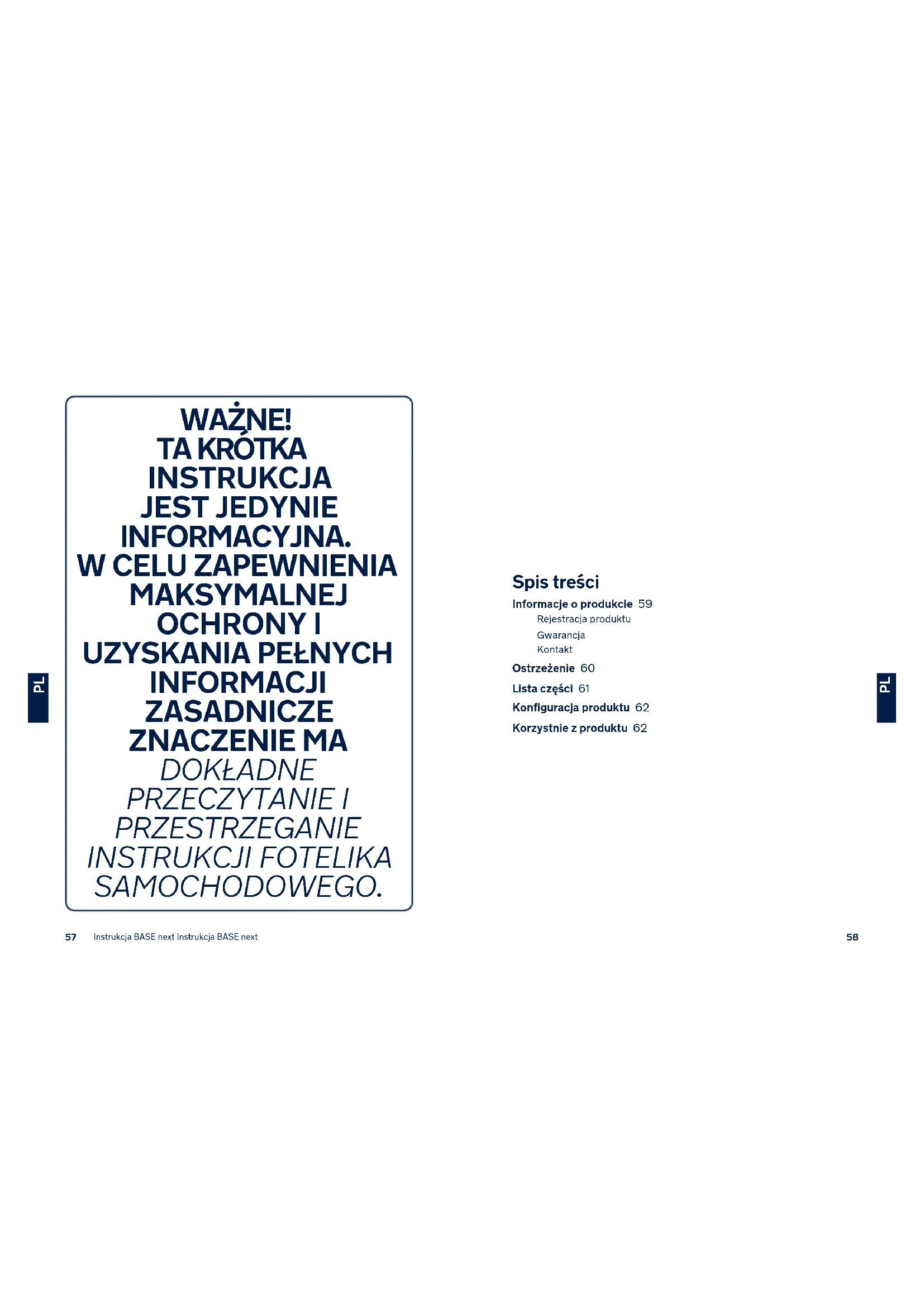 Instrukcja BASE next Instrukcja BASE next Spis treści Informacje o produkcie 59 Rejestracja produktu Gwarancja Kontakt Ostrzeżenie 60 Lista części 61 Konfiguracja produktu 62 Korzystnie z produktu 62 WAŻNE!
