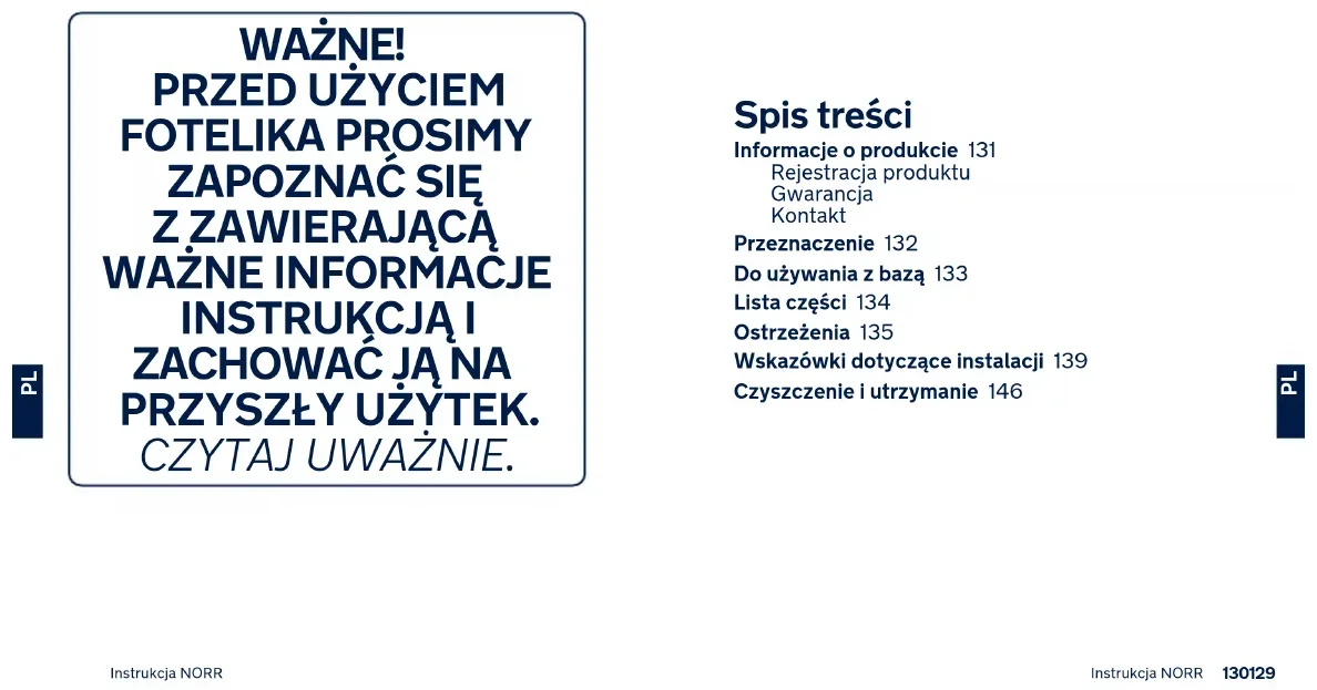 PLKontakt W celu uzyskania informacji na temat części zamiennych, serwisu lub jakichkolwiek dodatkowych pytań skontaktujcie się z naszym działem obsługi klienta. info@nunababy.com www.nunababy.com Przeznaczenie Produkt przeznaczony jest dla dzieci, które spełniają poniższe wymagania: Ustawienie tyłem do kierunku jazdy: Wzrost dziecka 40cm-105cm/ Waga dziecka ≤ 18kg Tryb instalacji Instalacja Pozycja- leżąca 1-7 Wzrost dziecka 40cm- 105cm/ Waga dziecka ≤ 18kg Tryb dziecka Informacje o produkcie Numer modelu: _______________________________________________________________________________________________________________ Data produkcji: ________________________________________________________________________________________________________________ Rejestracja produktu Prosimy wypełnić powyższe informacje. Numer modelu oraz data produkcji znajdują się na spodzie fotelika NORR. Aby zarejestrować produkt odwiedź stronę: www.nunababy.com Kliknij łącze „Zarejestruj produkt” na stronie domowej. Gwarancja Nasze wysokiej jakości produkty zaprojektowaliśmy tak, aby mogły rosnąć razem z Twoim dzieckiem jak również z całą rodziną. Ponieważ jesteśmy przekonani o jakości naszych produktów, nasz produkt objęty jest 2 letnią gwarancją konsumencką już od dnia jego zakupu. Zachowaj dowód zakupu, numer modelu, oraz datę produkcji podczas kontaktu w sprawie gwarancji. W celu uzyskania informacji o gwarancji, należy odwiedzić stronę internetową: www.nunababy.com Kliknij łącze „Gwarancja” na stronie domowej.