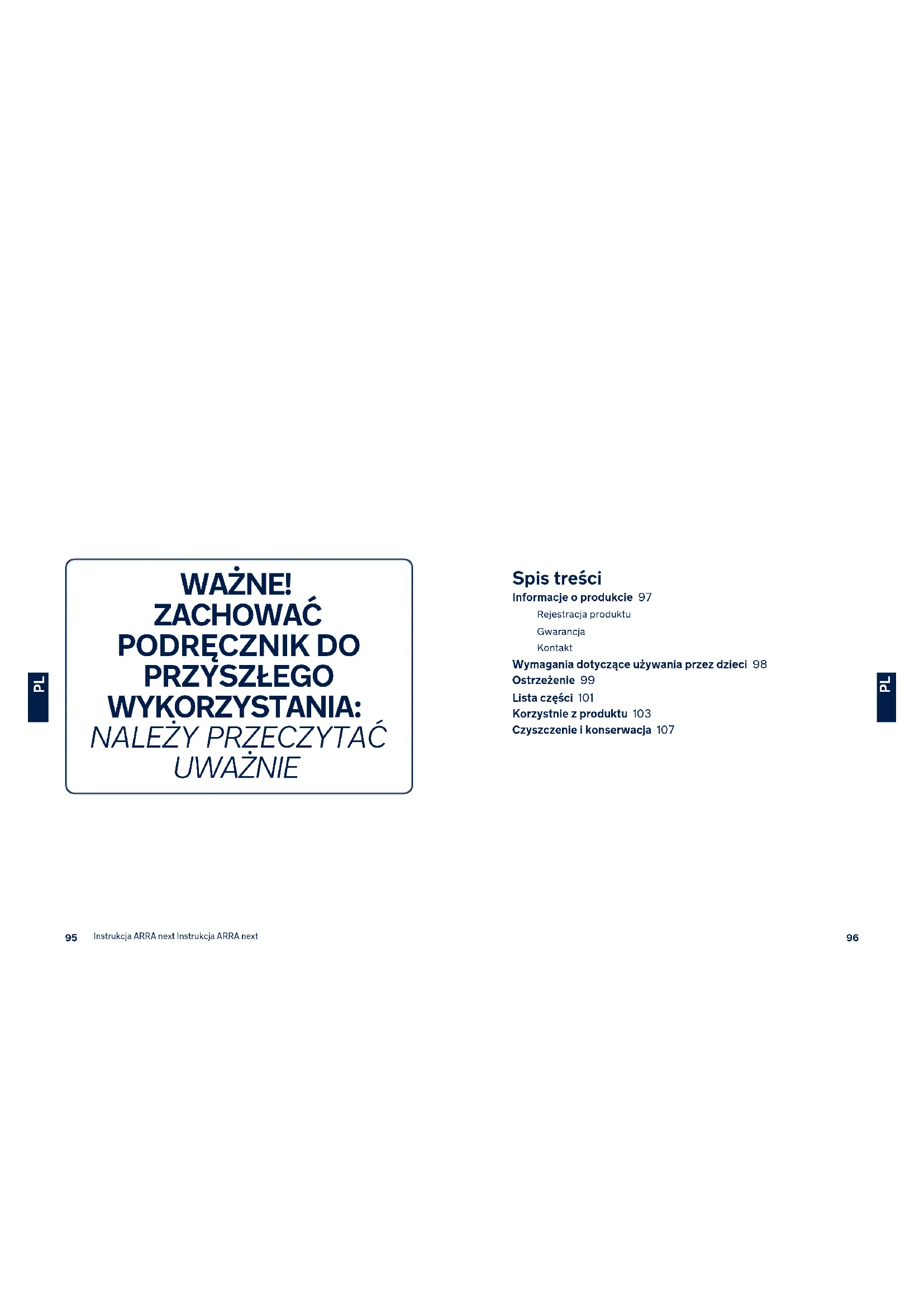 UWAŻNIE Spis treści Informacje o produkcie 97 Rejestracja produktu Gwarancja Kontakt Wymagania dotyczące używania przez dzieci 98 Ostrzeżenie 99 Lista części 101 Korzystnie z produktu 103 Czyszczenie i konserwacja 1079897 Instrukcja ARRA next Instrukcja ARRA next
