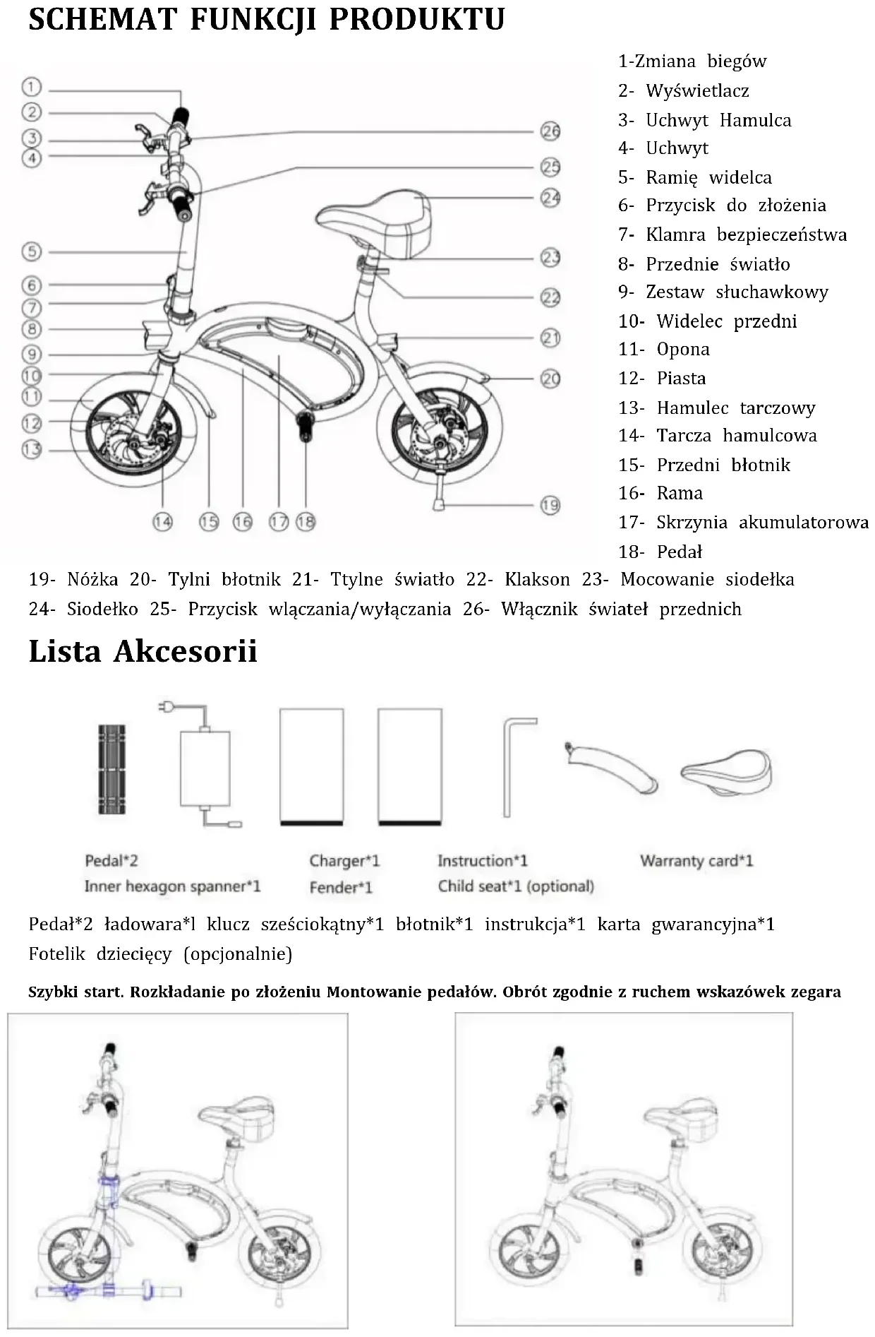 Lista Akcesorii Pedał*2 ładowara*l klucz sześciokątny*1 błotnik*1 instrukcja*1 karta gwarancyjna*1 Fotelik dziecięcy (opcjonalnie) Szybki start. Rozkładanie po złożeniu Montowanie pedałów. Obrót zgodnie z ruchem wskazówek zegaraFunkcje