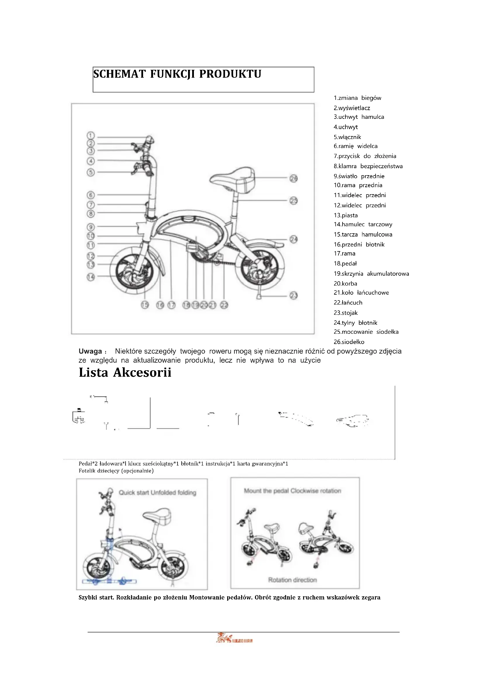 gear. While it is assisting mode, also can use the electric mode.PARAMETERS Size Material Metal Folding size 1040*205*720mm Released size 1040*205*940mm Pedal height 80mm Hub size 12inch Package size 1050*220*650mm Color Black Performance Weight 18kg Max load 120kg Riding speed 20km/h Max speed 25km/h Mileage(pure electric) 40±3km Assistant-Mileage 60km Uphill 15 degree Temperature -10~45℃ Waterproof IP54 Standards Battery 10Ah Rated power 250W Rated voltage 36V Charging voltage DC42V Input voltage AC100~220V BMS Yes Charging time 6-8H Features App Yes Personal sticker Optional Lights Yes/ Head light+ rear lgiht Cruise Yes Brake mode Front and rear disc brakes Remark: Many factors will affect the max speed,such as power,load,tyre pressure,road conditions,chain,lubrication degree etc. Mileage has been measured on basis of temperature 25℃,load of 60KG,speed of 15-20KM/H,smooth and hard road,and from full battery to dead battery. It also is subjected to other factors,such as driving habits,tempera- ture,load,tyre presure,road conditions etc.”CAUTION Charge between 0 degree- 45 degree, rife between -20 degree to 60 degree, keep the battery dry. Don’t put it in acid and alkalinity fluid. No rain, fire and heat. Don’t put the battery positive an negative wrong. Don’t damage disassemble the battery or use the wrong adapter. Don’t charge it over 6 hours and don’t charge it over 2A. When not using for a long time, please put the battery in dry and cool place and charge it for 2 hours every 2 months. Follow the instruction or the user will be responsible for the consequence. When charging, Please be careful of the battery type and voltage, place the battery in open air and don’t put it under bright sun shine and closed space. When charging, please place the battery first, then connect the electricity; after charging, cut the electricity then cut the battery plug. When the green light lights up, turn off the power, don’t connect the battery when not charging. When charging, if the indicating light goes wrong or some strange smell shows up or the charger is over hot, please stop charging immediately, them check and repair or replace the charger. When using or storing the charging. In case of something wrong were dropped into the charger, especially the water or other fluids, please don’t take the charger when possible. Otherwise, be careful and put it in the cool box. No disassembling the charger yourself. Please check the brake before riding. Please brake the rear wheel first. Be careful of the tightness of brake, use the hexagon wrench when it’s loose. Rainy and snowy days need longer braking distance. Suitable age :16-45 years old. Riding Read the instruction first to know the product performance first. Don’t lend it to someone who is not familiar with it. Wear a helmet when riding. Obey the traffic rules and don’t ride it in the cars road.Don’t riding it in the crowded road. When go downhill or slippery road, the speed should be under 15km/h. Inspect the Tyre before riding, Tyre pressure should be 35-45PSI. Don’t over impact the motor, keep the axile smooth. Don’t over load.(Max load is 120kg) Please be careful of the adding distance when it under the rainy day and snow day. Single-handed ride is prohibited. Maintenance The E-bike front and back wheel should be at the center of the frame. Put the E-bike up after riding at cool and dry place. Check the Motor and Brake often, don’t inject the oil onto the brake. Check the E-bike and screws and places that need fixing, fix it often. Suggested torsion: Bar screws 60-80 kgf.cm, bar stand screws 175-200kgf.cm, wheel screws 320-450kgf.cm. Check the Tyre is pierced and leaks air, please contact professional technician for repairing and replacing. Responsibility announcement All the product model, type and related information copy right and explain right are reserved. This instruction is suitable for denoted models. Any changing or replace part of the E-bike will not be informed again. Read the instructions and follow the instructions or the user will be responsible for the damage.SCHEMAT FUNKCJI PRODUKTU 1.zmiana biegów 2.wyświetlacz 3.uchwyt hamulca 4.uchwyt 5.włącznik 6.ramię widelca 7.przycisk do złożenia 8.klamra bezpieczeństwa 9.światło przednie 10.rama przednia 11.widelec przedni 12.widelec przedni 13.piasta 14.hamulec tarczowy 15.tarcza hamulcowa 16.przedni błotnik 17.rama 18.pedał 19.skrzynia akumulatorowa 20.korba 21.koło łańcuchowe 22.łańcuch 23.stojak 24.tylny błotnik 25.mocowanie siodełka 26.siodełko Uwaga : Niektóre szczegóły twojego roweru mogą się nieznacznie różnić od powyższego zdjęcia ze względu na aktualizowanie produktu, lecz nie wpływa to na użycie Lista Akcesorii Pedał*2 ładowara*l klucz sześciokątny*1 błotnik*1 instrukcja*1 karta gwarancyjna*1 Fotelik dziecięcy (opcjonalnie) Szybki start. Rozkładanie po złożeniu Montowanie pedałów. Obrót zgodnie z ruchem wskazówek zegaraFunkcje DC2.1 charge port 1.Instalacja: Po rozpakowaniu poluzuj kierownicę i szybko zwolnij, wyreguluj uchwyt poziomy w odpowiednim kierunku, zablokuj uchwyt poziomy i delikatnie kilkakrotnie przytrzymaj dźwignię hamulca, wyreguluj przewody hamulcowe do najlepszego stanu. 2.On / off: Naciśnij przycisk przełącznika na lewym uchwycie, aby włączyć rower elektryczny, deska rozdzielcza zaświeci się; Naciśnij ponownie przycisk przełącznika, aby wyłączyć rower elektryczny. 3.Ładowanie: podłącz ładowarkę do wtyczki zasilania, a następnie do roweru elektrycznego. Kiedy wskaźnik ładowarki zmieni kolor na zielony z czerwonego, pokazuje pełną moc. 4.Stan baterii: Po uruchomieniu, deska rozdzielcza zapala się i pojawia się prąd, ma cztery siatki, odpowiadające odpowiednio wysokiej, średniej i niskiej mocy 5.Hamowanie: używaj hamulców tarczowych, nie możesz przyspieszyć przed całkowitym zwolnieniem hamulca. 6.Reflektor: reflektor jest w trybie sterowania ręczn