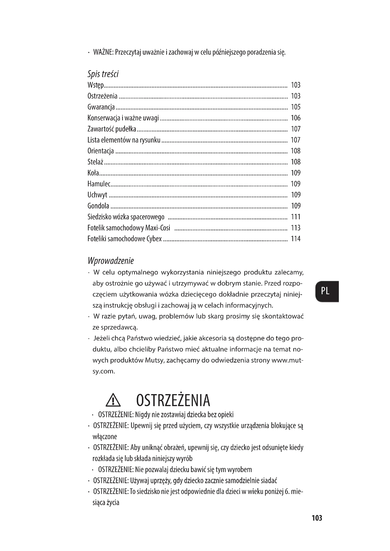- OSTRZEŻENIE: Umieszczanie toreb lub akcesoriów na produkcie w sposób niezgod- ny z zaleceniami producenta może spowodować brak stabilności wózka dziecięce- go. Należy używać wyłącznie oryginalnych akcesoriów Mutsy.