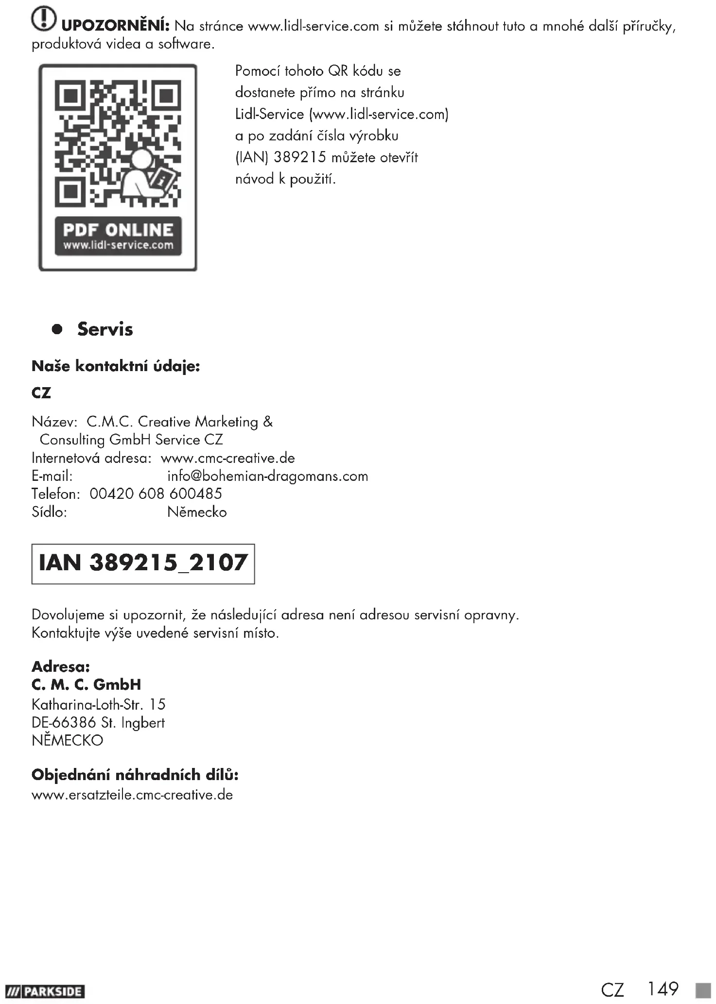Nazwa: GTX Service Sp. z o.o. Sp.k. Strona www: www.gtxservice.pl Adres e-Mail: bok@gtxservice.com Numer telefonu: 0048 22 364 53 50 IAN 389215_2107 Należy pamiętać, że poniższy adres nie jest adresem serwisu. Najpierw należy skontaktować się zpunktem serwisowym wymienionym powyżej. Adres: C. M. C. GmbH Katharina-Loth-Str. 15 DE-66386 St. Ingbert NIEMCY Zamawianie części zamiennych: www.ersatzteile.cmc-creative.deSK