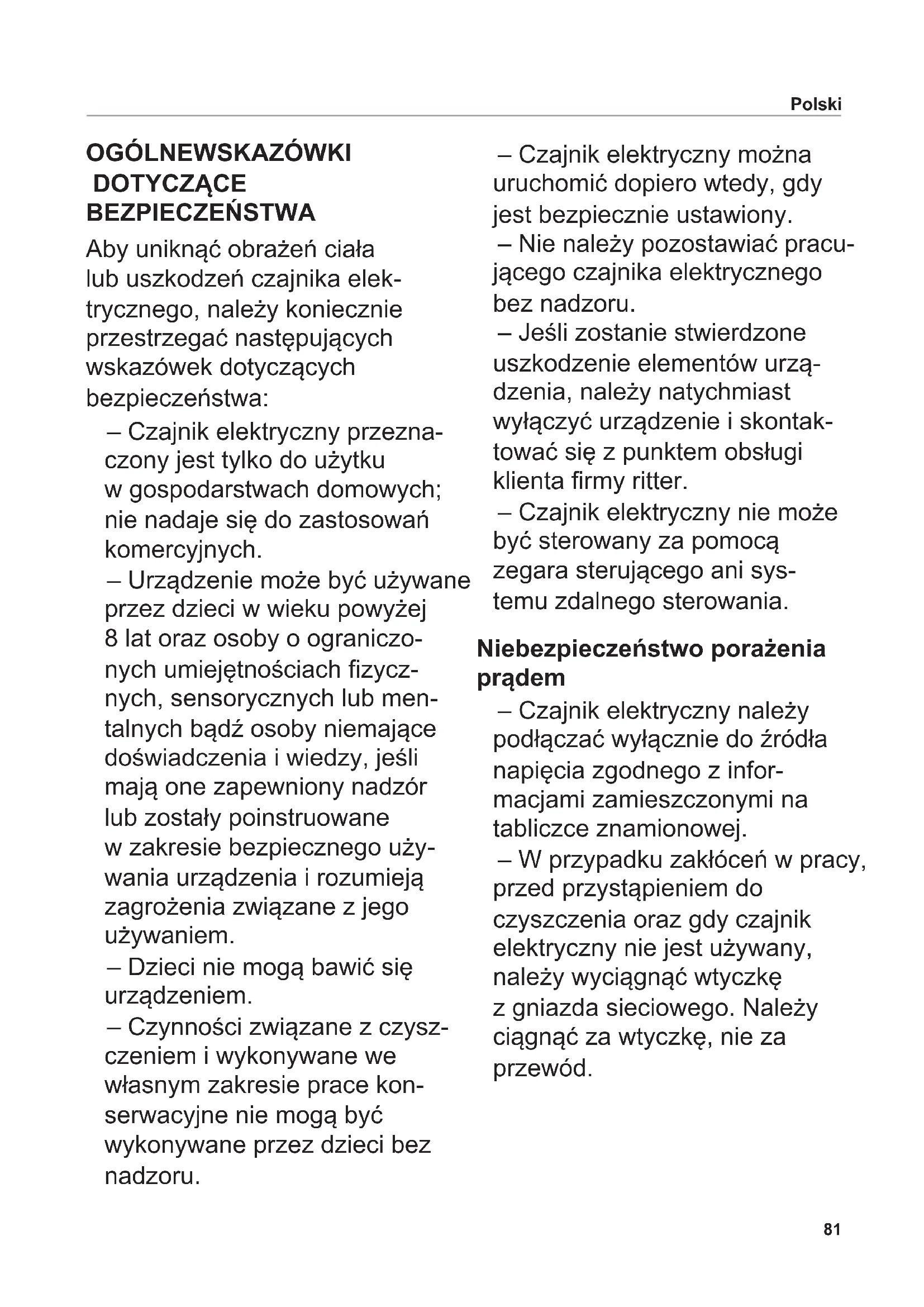 DOTYCZĄCE BEZPIECZEŃSTWA Aby uniknąć obrażeń ciała lub uszkodzeń czajnika elek- trycznego, należy koniecznie przestrzegać następujących wskazówek dotyczących bezpieczeństwa: – Czajnik elektryczny przezna- czony jest tylko do użytku w gospodarstwach domowych; nie nadaje się do zastosowań komercyjnych. – Urządzenie może być używane przez dzieci w wieku powyżej 8 lat oraz osoby o ograniczo- nych umiejętnościach zycz- nych, sensorycznych lub men- talnych bądź osoby niemające doświadczenia i wiedzy, jeśli mają one zapewniony nadzór lub zostały poinstruowane w zakresie bezpiecznego uży- wania urządzenia i rozumieją zagrożenia związane z jego używaniem. – Dzieci nie mogą bawić się urządzeniem. – Czynności związane z czysz- czeniem i wykonywane we własnym zakresie prace kon- serwacyjne nie mogą być wykonywane przez dzieci bez nadzoru. – Czajnik elektryczny można uruchomić dopiero wtedy, gdy jest bezpiecznie ustawiony. – Nie należy pozostawiać pracu- jącego czajnika elektrycznego bez nadzoru. – Jeśli zostanie stwierdzone uszkodzenie elementów urzą- dzenia, należy natychmiast wyłączyć urządzenie i skontak- tować się z punktem obsługi klienta rmy ritter. – Czajnik elektryczny nie może być sterowany za pomocą zegara sterującego ani sys- temu zdalnego sterowania. Niebezpieczeństwo porażenia prądem – Czajnik elektryczny należy podłączać wyłącznie do źródła napięcia zgodnego z infor- macjami zamieszczonymi na tabliczce znamionowej. – W przypadku zakłóceń w pracy, przed przystąpieniem do czyszczenia oraz gdy czajnik elektryczny nie jest używany, należy wyciągnąć wtyczkę z gniazda sieciowego. Należy ciągnąć za wtyczkę, nie za przewód.82 Polski – Nie należy zanurzać pod- stawy zasilającej w wodzie. W żadnym wypadku nie należy wystawiać podstawy zasilającej na deszcz ani w inny sposób narażać na działanie wilgoci. Jeżeli podstawa zasilająca wpadnie do wody, należy najpierw wyciągnąć wtyczkę z gniazda sieciowego, a dopiero potem wyciągnąć podstawę zasilającą z wody. Przed ponownym użyciem pod- stawy zasilającej należy zlecić jej kontrolę w autoryzowanym punkcie serwisowym. – Nie należy dotykać podstawy zasilającej wilgotnymi rękami. Nie należy używać czajnika elektrycznego, gdy podstawa zasilająca jest wilgotna lub mokra bądź stoi na wilgot- nym podłożu. Nie należy uży- wać czajnika elektrycznego na zewnątrz pomieszczeń. – Skroploną parę wodną i wodę, która się przelała, należy natychmiast wycierać. Zawsze należy najpierw wyciągnąć wtyczkę z gniazda sieciowego. – Nie należy napełniać zbiornika na wodę, gdy jest on umiesz- czony na podstawie zasilającej, gdyż rozlana woda może spo- wodować porażenie prądem elektrycznym. – Czajnika elektrycznego należy używać tylko wówczas, gdy przewód sieciowy, podstawa zasilająca i zbiornik na wodę nie wykazują żadnych widocz- nych uszkodzeń. Uszkodzony przewód zasilający musi zostać wymieniony przez produ- centa, serwis producenta lub inne wykwalikowane osoby; pozwoli to uniknąć zagrożeń. – Pod żadnym pozorem nie należy podczas wykony- wania prac przy podstawie zasilającej używać metalowych przedmiotów. – Czajnika elektrycznego należy używać tylko z odpowied- nią podstawą zasilającą (typ fontana