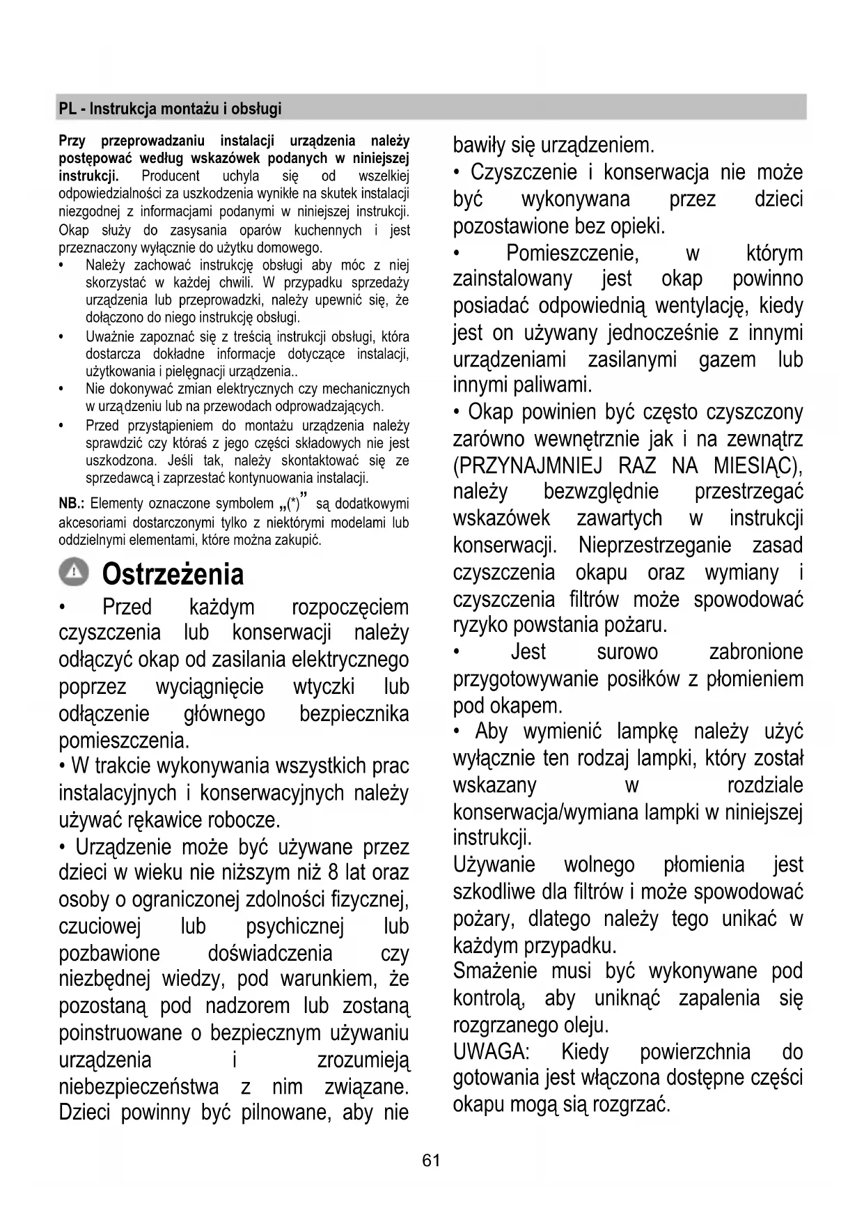 Genmonter risten. Hvis belysningen ikke fungerer, skal man kontrollere, at lampen er korrekt indsat i fatningen, før der rettes henvendelse til et servicecenter.61 PL - Instrukcja montażu i obsługi Przy przeprowadzaniu instalacji urządzenia należy postępować według wskazówek podanych w niniejszej instrukcji. Producent uchyla się od wszelkiej odpowiedzialności za uszkodzenia wynikłe na skutek instalacji niezgodnej z informacjami podanymi w niniejszej instrukcji. Okap służy do zasysania oparów kuchennych i jest przeznaczony wyłącznie do użytku domowego.