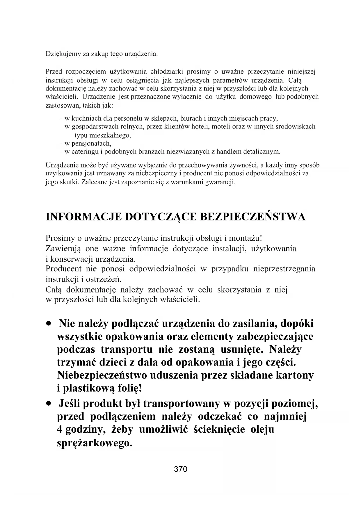 - Usuwanie usterek 369370 Dziękujemy za zakup tego urządzenia. Przed rozpoczęciem użytkowania chłodziarki prosimy o uważne przeczytanie niniejszej instrukcji obsługi w celu osiągnięcia jak najlepszych parametrów urządzenia. Całą dokumentację należy zachować w celu skorzystania z niej w przyszłości lub dla kolejnych właścicieli. Urządzenie jest przeznaczone wyłącznie do użytku domowego lub podobnych zastosowań, takich jak: - w kuchniach dla personelu w sklepach, biurach i innych miejscach pracy, - w gospodarstwach rolnych, przez klientów hoteli, moteli oraz w innych środowiskach typu mieszkalnego, - w pensjonatach, - w cateringu i podobnych branżach niezwiązanych z handlem detalicznym. Urządzenie może być używane wyłącznie do przechowywania żywności, a każdy inny sposób użytkowania jest uznawany za niebezpieczny i producent nie ponosi odpowiedzialności za jego skutki. Zalecane jest zapoznanie się z warunkami gwarancji. p. 392