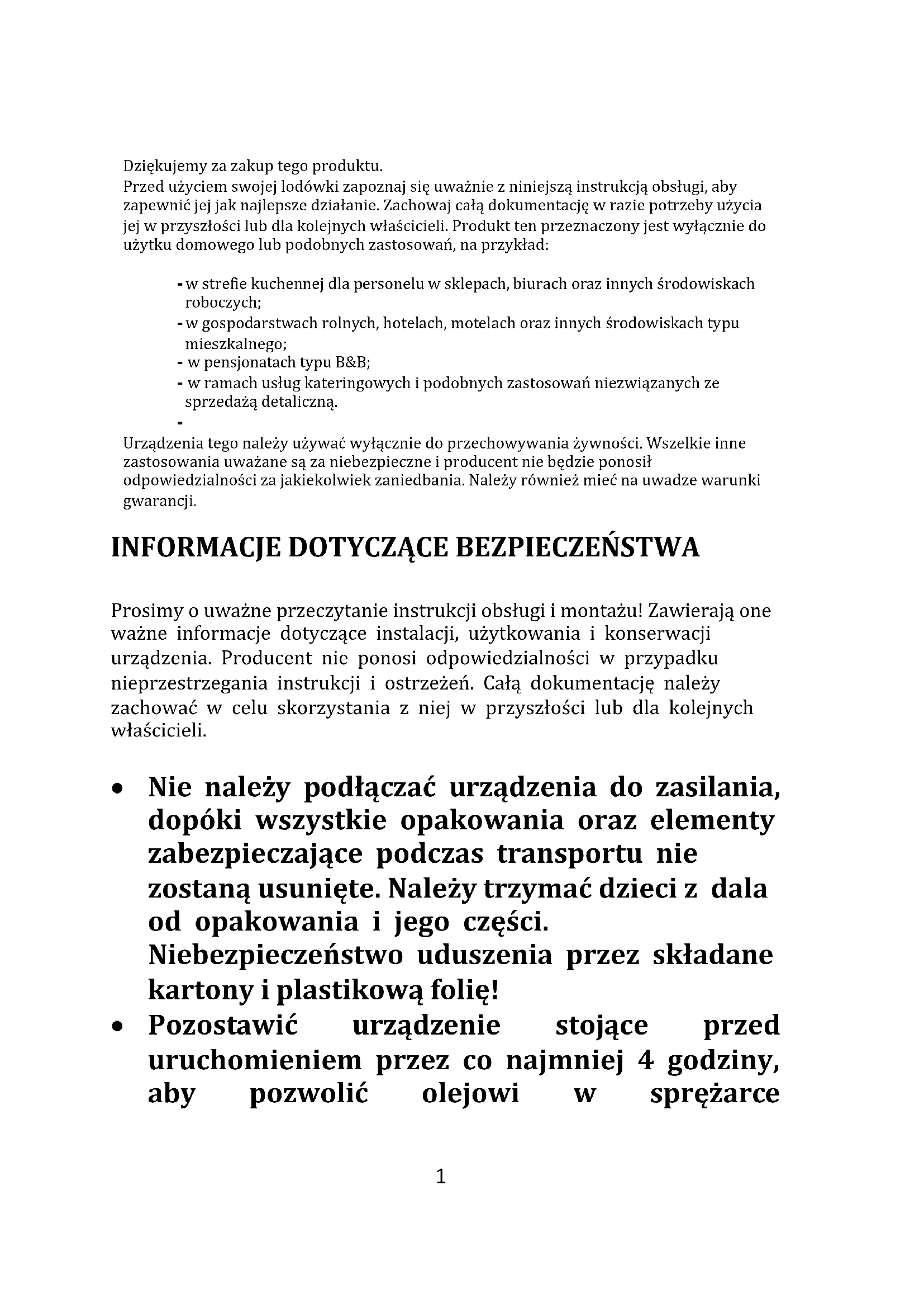 Dziękujemy za zakup tego produktu. Przed użyciem swojej lodówki zapoznaj się uważnie z niniejszą instrukcją obsługi, aby zapewnić jej jak najlepsze działanie. Zachowaj całą dokumentację w razie potrzeby użycia jej w przyszłości lub dla kolejnych właścicieli. Produkt ten przeznaczony jest wyłącznie do użytku domowego lub podobnych zastosowań, na przykład: - w strefie kuchennej dla personelu w sklepach, biurach oraz innych środowiskach roboczych; - w gospodarstwach rolnych, hotelach, motelach oraz innych środowiskach typu mieszkalnego; - w pensjonatach typu B&B; - w ramach usług kateringowych i podobnych zastosowań niezwiązanych ze sprzedażą detaliczną.