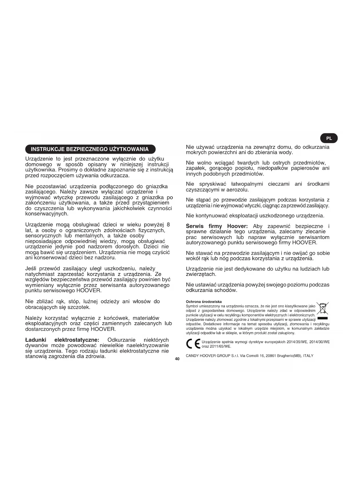 Urządzenie to jest przeznaczone wyłącznie do użytku domowego w sposób opisany w niniejszej instrukcji użytkownika. Prosimy o dokładne zapoznanie się z instrukcją przed rozpoczęciem używania odkurzacza. Nie pozostawiać urządzenia podłączonego do gniazdka zasilającego. Należy zawsze wyłączać urządzenie i wyjmować wtyczkę przewodu zasilającego z gniazdka po zakończeniu użytkowania, a także przed przystąpieniem do czyszczenia lub wykonywania jakichkolwiek czynności konserwacyjnych. Urządzenie mogą obsługiwać dzieci w wieku powyżej 8 lat, a osoby o ograniczonych zdolnościach zycznych, sensorycznych lub mentalnych, a także osoby nieposiadające odpowiedniej wiedzy, mogą obsługiwać urządzenie jedynie pod nadzorem dorosłych. Dzieci nie mogą bawić się urządzeniem. Urządzenia nie mogą czyścić ani konserwować dzieci bez nadzoru. Jeśli przewód zasilający uległ uszkodzeniu, należy natychmiast zaprzestać korzystania z urządzenia. Ze względów bezpieczeństwa przewód zasilający powinien być wymieniany wyłącznie przez serwisanta autoryzowanego punktu serwisowego HOOVER. Nie zbliżać rąk, stóp, luźnej odzieży ani włosów do obracających się szczotek. Należy korzystać wyłącznie z końcówek, materiałów eksploatacyjnych oraz części zamiennych zalecanych lub dostarczonych przez rmę HOOVER. Ładunki elektrostatyczne: Odkurzanie niektórych dywanów może powodować niewielkie naelektryzowanie się urządzenia. Tego rodzaju ładunki elektrostatyczne nie stanowią zagrożenia dla zdrowia. Nie używać urządzenia na zewnątrz domu, do odkurzania mokrych powierzchni ani do zbierania wody. Nie wolno wciągać twardych lub ostrych przedmiotów, zapałek, gorącego popiołu, niedopałków papierosów ani innych podobnych przedmiotów. Nie spryskiwać łatwopalnymi cieczami ani środkami czyszczącymi w aerozolu. Nie stąpać po przewodzie zasilającym podczas korzystania z urządzenia i nie wyjmować wtyczki, ciągnąc za przewód zasilający. Nie kontynuować eksploatacji uszkodzonego urządzenia. Serwis rmy Hoover: Aby zapewnić bezpieczne i sprawne działanie tego urządzenia, zalecamy zlecanie prac serwisowych lub napraw wyłącznie serwisantom autoryzowanego punktu serwisowego rmy HOOVER. Nie stawać na przewodzie zasilającym i nie owijać go sobie wokół rąk lub nóg podczas korzystania z urządzenia. Urządzenie nie jest dedykowane do użytku na ludziach lub zwierzętach. Nie ustawiać urządzenia powyżej swojego poziomu podczas odkurzania schodów. Ochrona środowiska Symbol umieszczony na urządzeniu oznacza, że nie jest ono klasykowane jako odpad z gospodarstwa domowego. Urządzenie należy zdać w odpowiednim punkcie utylizacji w celu recyklingu komponentów elektrycznych i elektronicznych. Urządzenie należy złomować zgodnie z lokalnymi przepisami w sprawie utylizacji odpadów. Dodatkowe informacje na temat sposobu utylizacji, złomowania i recyklingu urządzenia można uzyskać w lokalnym urzędzie miejskim, w komunalnym zakładzie utylizacji odpadów lub w sklepie, w którym produkt został zakupiony. Urządzenie spełnia wymogi dyrektyw europejskich 2014/35/WE, 2014/30/WE oraz 2011/65/WE. CANDY HOOVER GROUP S.r.l. Via Comolli 16, 20861 Brugherio(MB), ITALY PL41 M. Szczotka dywanowo-podłogowa** N. Obudowa główna odkurzacza O. Przycisk zwalniania klapy worka P. Obsada worka Q. Rama ltra przed silnikiem R. Filtr przed silnikiem S. Filtr wylotowy T. Turboszczotka mini do usuwania sierści zwierząt* U. Turboszczotka mini do usuwania alergenów*