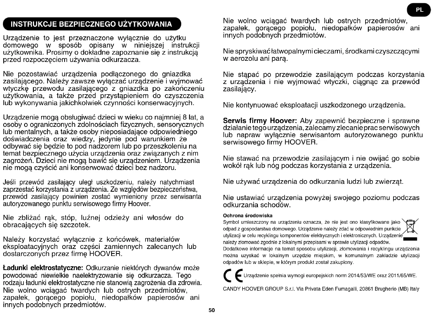 Urządzenie to jest przeznaczone wyłącznie do użytku domowego w sposób opisany w niniejszej instrukcji użytkownika. Prosimy o dokładne zapoznanie się z instrukcją przed rozpoczęciem używania odkurzacza. Nie pozostawiać urządzenia podłączonego do gniazdka zasilającego. Należy zawsze wyłączać urządzenie i wyjmować wtyczkę przewodu zasilającego z gniazdka po zakończeniu użytkowania, a także przed przystąpieniem do czyszczenia lub wykonywania jakichkolwiek czynności konserwacyjnych. Urządzenie mogą obsługiwać dzieci w wieku co najmniej 8 lat, a osoby o ograniczonych zdolnościach zycznych, sensorycznych lub mentalnych, a także osoby nieposiadające odpowiedniego doświadczenia oraz wiedzy, jedynie pod warunkiem że odbywać się będzie to pod nadzorem lub po przeszkoleniu na temat bezpiecznego użycia urządzenia oraz związanych z nim zagrożeń. Dzieci nie mogą bawić się urządzeniem. Urządzenia nie mogą czyścić ani konserwować dzieci bez nadzoru. Jeśli przewód zasilający uległ uszkodzeniu, należy natychmiast zaprzestać korzystania z urządzenia. Ze względów bezpieczeństwa, przewód zasilający powinien zostać wymieniony przez serwisanta autoryzowanego punktu serwisowego rmy Hoover. Nie zbliżać rąk, stóp, luźnej odzieży ani włosów do obracających się szczotek. Należy korzystać wyłącznie z końcówek, materiałów eksploatacyjnych oraz części zamiennych zalecanych lub dostarczonych przez rmę HOOVER. Ładunki elektrostatyczne: Odkurzanie niektórych dywanów może powodować niewielkie naelektryzowanie się odkurzacza. Tego rodzaju ładunki elektrostatyczne nie stanowią zagrożenia dla zdrowia. Nie wolno wciągać twardych lub ostrych przedmiotów, zapałek, gorącego popiołu, niedopałków papierosów ani innych podobnych przedmiotów. Nie wolno wciągać twardych lub ostrych przedmiotów, zapałek, gorącego popiołu, niedopałków papierosów ani innych podobnych przedmiotów. Nie spryskiwać łatwopalnymi cieczami, środkami czyszczącymi w aerozolu ani parą. Nie stąpać po przewodzie zasilającym podczas korzystania z urządzenia i nie wyjmować wtyczki, ciągnąc za przewód zasilający. Nie kontynuować eksploatacji uszkodzonego urządzenia. Serwis rmy Hoover: Aby zapewnić bezpieczne i sprawne działanie tego urządzenia, zalecamy zlecanie prac serwisowych lub napraw wyłącznie serwisantom autoryzowanego punktu serwisowego rmy HOOVER. Nie stawać na przewodzie zasilającym i nie owijać go sobie wokół rąk lub nóg podczas korzystania z urządzenia. Nie używać urządzenia do odkurzania ludzi lub zwierząt. Nie ustawiać urządzenia powyżej swojego poziomu podczas odkurzania schodów. Ochrona środowiska Symbol umieszczony na urządzeniu oznacza, że nie jest ono klasykowane jako odpad z gospodarstwa domowego. Urządzenie należy zdać w odpowiednim punkcie utylizacji w celu recyklingu komponentów elektrycznych i elektronicznych. Urządzenie należy złomować zgodnie z lokalnymi przepisami w sprawie utylizacji odpadów. Dodatkowe informacje na temat sposobu utylizacji, złomowania i recyklingu urządzenia można uzyskać w lokalnym urzędzie miejskim, w komunalnym zakładzie utylizacji odpadów lub w sklepie, w którym produkt został zakupiony. Urządzenie spełnia wymogi europejskich norm 2014/53/WE oraz 2011/65/WE. CANDY HOOVER GROUP S.r.l. Via Privata Eden Fumagalli, 20861 Brugherio (MB) Italy PL51 MONTAŻ ODKURZACZA Wyjmij wszystkie elementy z opakowania.