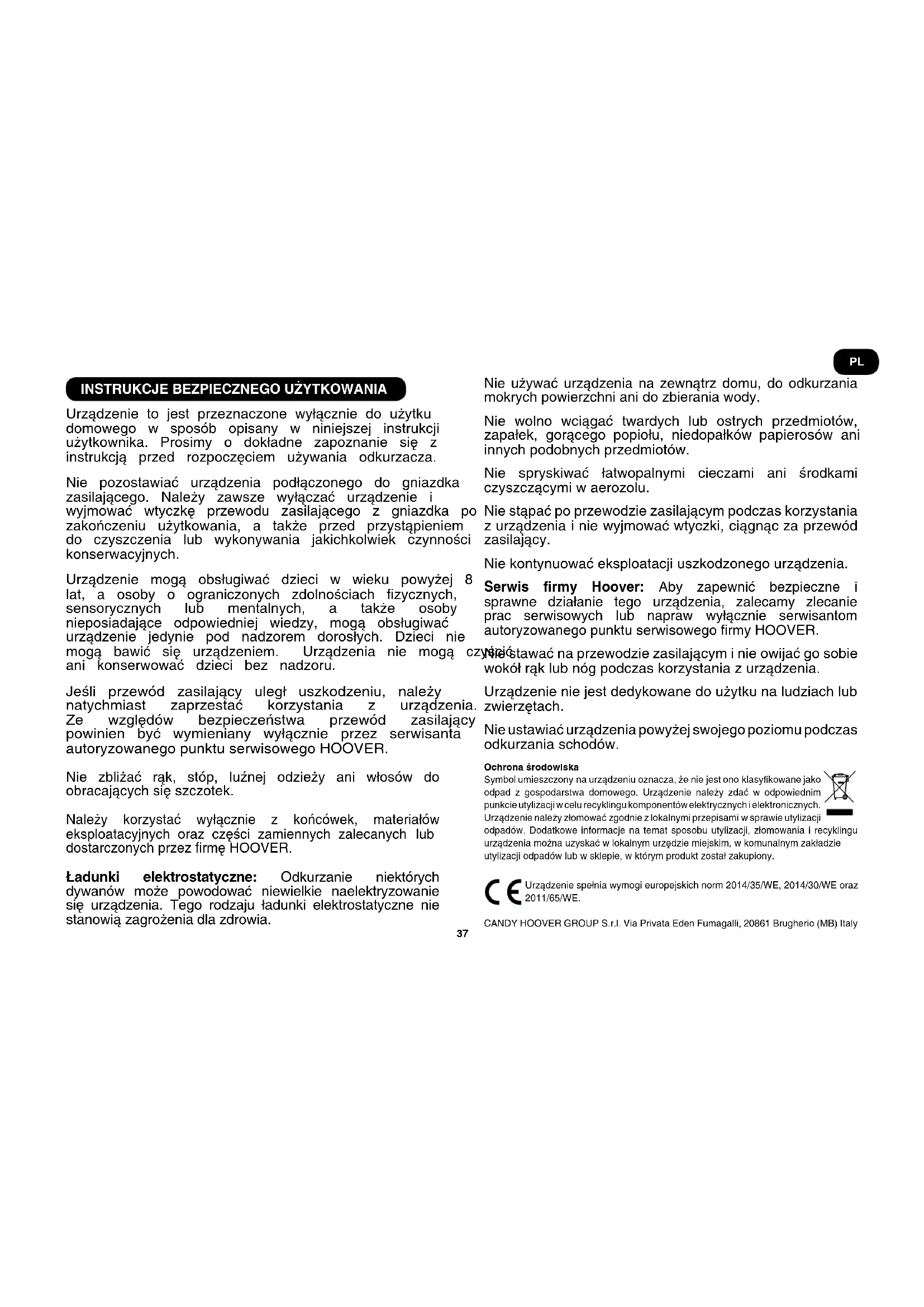 Urządzenie to jest przeznaczone wyłącznie do użytku domowego w sposób opisany w niniejszej instrukcji użytkownika. Prosimy o dokładne zapoznanie się z instrukcją przed rozpoczęciem używania odkurzacza. Nie pozostawiać urządzenia podłączonego do gniazdka zasilającego. Należy zawsze wyłączać urządzenie i wyjmować wtyczkę przewodu zasilającego z gniazdka po zakończeniu użytkowania, a także przed przystąpieniem do czyszczenia lub wykonywania jakichkolwiek czynności konserwacyjnych. Urządzenie mogą obsługiwać dzieci w wieku powyżej 8 lat, a osoby o ograniczonych zdolnościach zycznych, sensorycznych lub mentalnych, a także osoby nieposiadające odpowiedniej wiedzy, mogą obsługiwać urządzenie jedynie pod nadzorem dorosłych. Dzieci nie mogą bawić się urządzeniem. Urządzenia nie mogą czyścić ani konserwować dzieci bez nadzoru. Jeśli przewód zasilający uległ uszkodzeniu, należy natychmiast zaprzestać korzystania z urządzenia. Ze względów bezpieczeństwa przewód zasilający powinien być wymieniany wyłącznie przez serwisanta autoryzowanego punktu serwisowego HOOVER. Nie zbliżać rąk, stóp, luźnej odzieży ani włosów do obracających się szczotek. Należy korzystać wyłącznie z końcówek, materiałów eksploatacyjnych oraz części zamiennych zalecanych lub dostarczonych przez rmę HOOVER. Ładunki elektrostatyczne: Odkurzanie niektórych dywanów może powodować niewielkie naelektryzowanie się urządzenia. Tego rodzaju ładunki elektrostatyczne nie stanowią zagrożenia dla zdrowia. Nie używać urządzenia na zewnątrz domu, do odkurzania mokrych powierzchni ani do zbierania wody. Nie wolno wciągać twardych lub ostrych przedmiotów, zapałek, gorącego popiołu, niedopałków papierosów ani innych podobnych przedmiotów. Nie spryskiwać łatwopalnymi cieczami ani środkami czyszczącymi w aerozolu. Nie stąpać po przewodzie zasilającym podczas korzystania z urządzenia i nie wyjmować wtyczki, ciągnąc za przewód zasilający. Nie kontynuować eksploatacji uszkodzonego urządzenia. Serwis rmy Hoover: Aby zapewnić bezpieczne i sprawne działanie tego urządzenia, zalecamy zlecanie prac serwisowych lub napraw wyłącznie serwisantom autoryzowanego punktu serwisowego rmy HOOVER. Nie stawać na przewodzie zasilającym i nie owijać go sobie wokół rąk lub nóg podczas korzystania z urządzenia. Urządzenie nie jest dedykowane do użytku na ludziach lub zwierzętach. Nie ustawiać urządzenia powyżej swojego poziomu podczas odkurzania schodów. Ochrona środowiska Symbol umieszczony na urządzeniu oznacza, że nie jest ono klasykowane jako odpad z gospodarstwa domowego. Urządzenie należy zdać w odpowiednim punkcie utylizacji w celu recyklingu komponentów elektrycznych i elektronicznych. Urządzenie należy złomować zgodnie z lokalnymi przepisami w sprawie utylizacji odpadów. Dodatkowe informacje na temat sposobu utylizacji, złomowania i recyklingu urządzenia można uzyskać w lokalnym urzędzie miejskim, w komunalnym zakładzie utylizacji odpadów lub w sklepie, w którym produkt został zakupiony. Urządzenie spełnia wymogi europejskich norm 2014/35/WE, 2014/30/WE oraz 2011/65/WE. CANDY HOOVER GROUP S.r.l. Via Privata Eden Fumagalli, 20861 Brugherio (MB) Italy PL38 ELEMENTY ODKURZACZA A. Wąż B. Worek C. Pokrywa ltra wywiewnego D. Obudowa główna odkurzacza E. Uchwyt do przenoszenia F. Przycisk zwalniania klapy worka G. Mechaniczny wskaźnik napełnienia H. worka