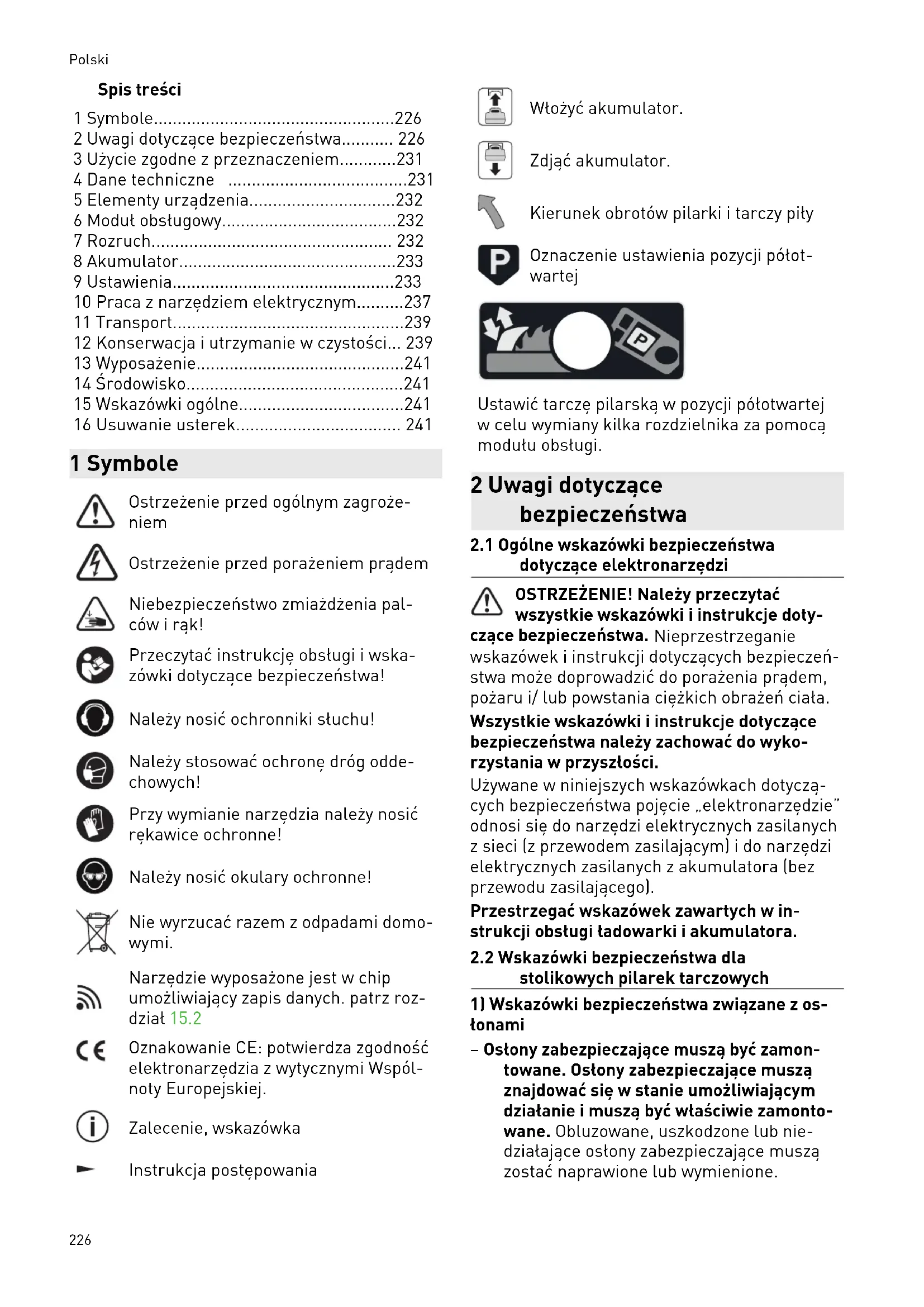 Oznakowanie CE: potwierdza zgodność elektronarzędzia z wytycznymi Wspól noty Europejskiej. Zalecenie, wskazówka Instrukcja postępowania Włożyć akumulator. Zdjąć akumulator. Kierunek obrotów pilarki i tarczy piły Oznaczenie ustawienia pozycji półot wartej Ustawić tarczę pilarską w pozycji półotwartej w celu wymiany kilka rozdzielnika za pomocą modułu obsługi. 2 Uwagi dotyczące bezpieczeństwa