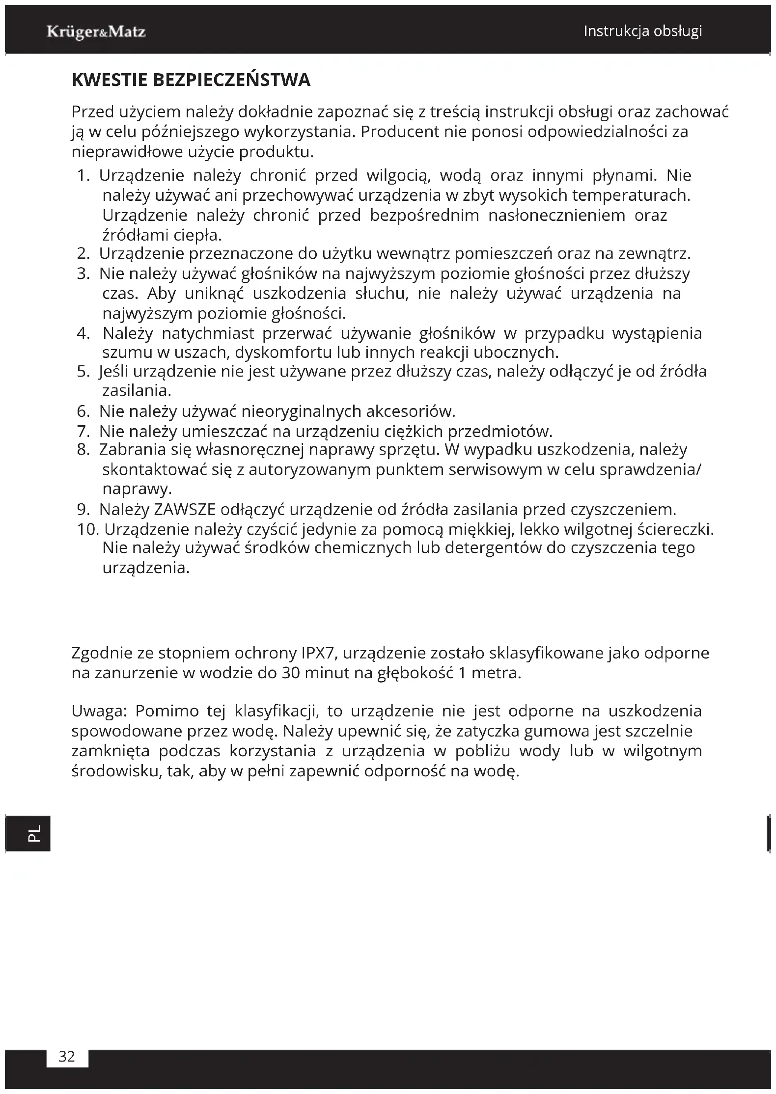 Uwaga: Pomimo tej klasyfikaksi, to urzadzenie nie jest odborne na uszkodzenia spowodowane przy wode. Nalezy upewnić sie, ze zatyczka gumowa jest szczelnie zamknieta podczas korzystania z urzadzenia w povlizu wody lub w wilgotnymŚrodowisku, tak, aby w pełni zapewnić odporność na wode.