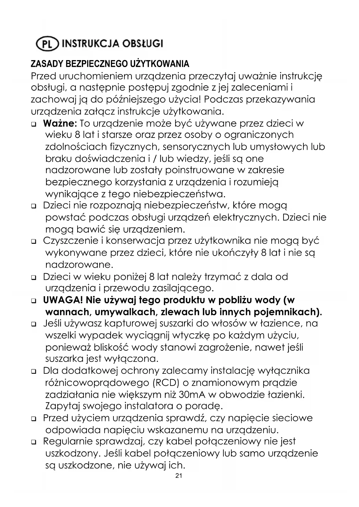 Przed uruchomieniem urządzenia przeczytaj uważnie instrukcję obsługi, a następnie postępuj zgodnie z jej zaleceniami i zachowaj ją do późniejszego użycia! Podczas przekazywania urządzenia załącz instrukcje użytkowania. Ważne: To urządzenie może być używane przez dzieci w wieku 8 lat i starsze oraz przez osoby o ograniczonych zdolnościach fizycznych, sensorycznych lub umysłowych lub braku doświadczenia i / lub wiedzy, jeśli są one nadzorowane lub zostały poinstruowane w zakresie bezpiecznego korzystania z urządzenia i rozumieją wynikające z tego niebezpieczeństwa. Dzieci nie rozpoznają niebezpieczeństw, które mogą powstać podczas obsługi urządzeń elektrycznych. Dzieci nie mogą bawić się urządzeniem. Czyszczenie i konserwacja przez użytkownika nie mogą być wykonywane przez dzieci, które nie ukończyły 8 lat i nie są nadzorowane. Dzieci w wieku poniżej 8 lat należy trzymać z dala od urządzenia i przewodu zasilającego. UWAGA! Nie używaj tego produktu w pobliżu wody (w wannach, umywalkach, zlewach lub innych pojemnikach). Jeśli używasz kapturowej suszarki do włosów w łazience, na wszelki wypadek wyciągnij wtyczkę po każdym użyciu, ponieważ bliskość wody stanowi zagrożenie, nawet jeśli suszarka jest wyłączona. Dla dodatkowej ochrony zalecamy instalację wyłącznika różnicowoprądowego (RCD) o znamionowym prądzie zadziałania nie większym niż 30mA w obwodzie łazienki. Zapytaj swojego instalatora o poradę. Przed użyciem urządzenia sprawdź, czy napięcie sieciowe odpowiada napięciu wskazanemu na urządzeniu. Regularnie sprawdzaj, czy kabel połączeniowy nie jest uszkodzony. Jeśli kabel połączeniowy lub samo urządzenie są uszkodzone, nie używaj ich.