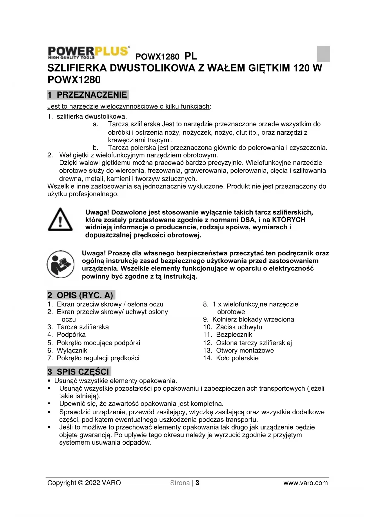 Copyright © 2022 VARO Strona | 3 www.varo.com SZLIFIERKA DWUSTOLIKOWA Z WAŁEM GIĘTKIM 120 W POWX1280 1 PRZEZNACZENIE Jest to narzędzie wieloczynnościowe o kilku funkcjach: