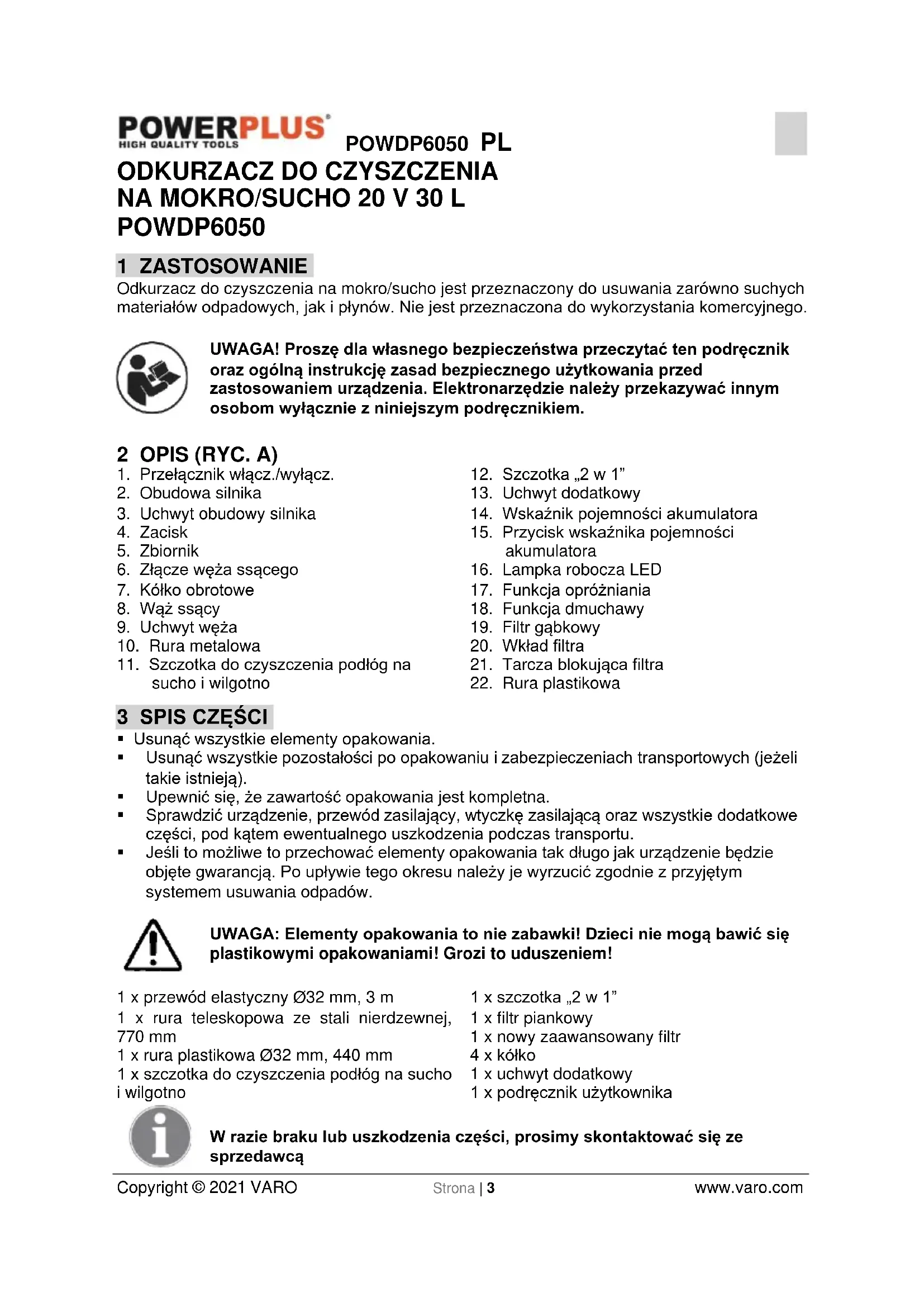 - Jako dowód zakupu należy zachować rachunek.POWDP6050 PL Copyright © 2021 VARO Strona | 12 www.varo.com