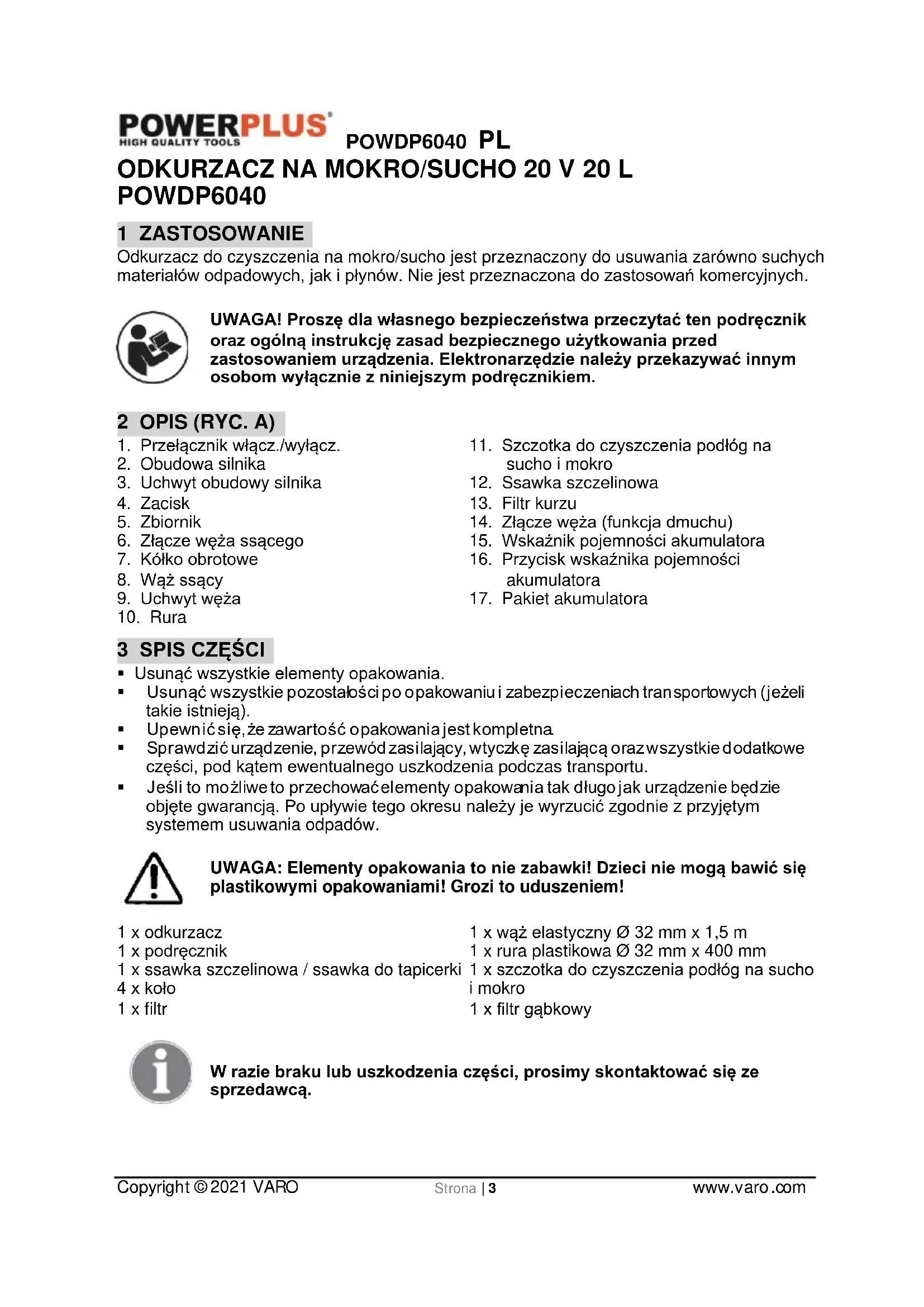 - Jeśli to możliwe to przechować elementy opakowania tak długo jak urządzenie będzie objęte gwarancją. Po upływie tego okresu należy je wyrzucić zgodnie z przyjętym systemem usuwania odpadów. UWAGA: Elementy opakowania to nie zabawki! Dzieci nie mogą bawić się plastikowymi opakowaniami! Grozi to uduszeniem! 1 x odkurzacz 1 x podręcznik 1 x ssawka szczelinowa / ssawka do tapicerki 4 x koło 1 x filtr 1 x wąż elastyczny Ø 32 mm x 1,5 m 1 x rura plastikowa Ø 32 mm x 400 mm 1 x szczotka do czyszczenia podłóg na sucho i mokro 1 x filtr gąbkowy W razie braku lub uszkodzenia części, prosimy skontaktować się ze sprzedawcą.POWDP6040 PL Copyright © 2021 VARO Strona | 4 www.varo.com 4 OZNACZENIA W niniejszej instrukcji i/lub na urządzeniu użyto następujących symboli: