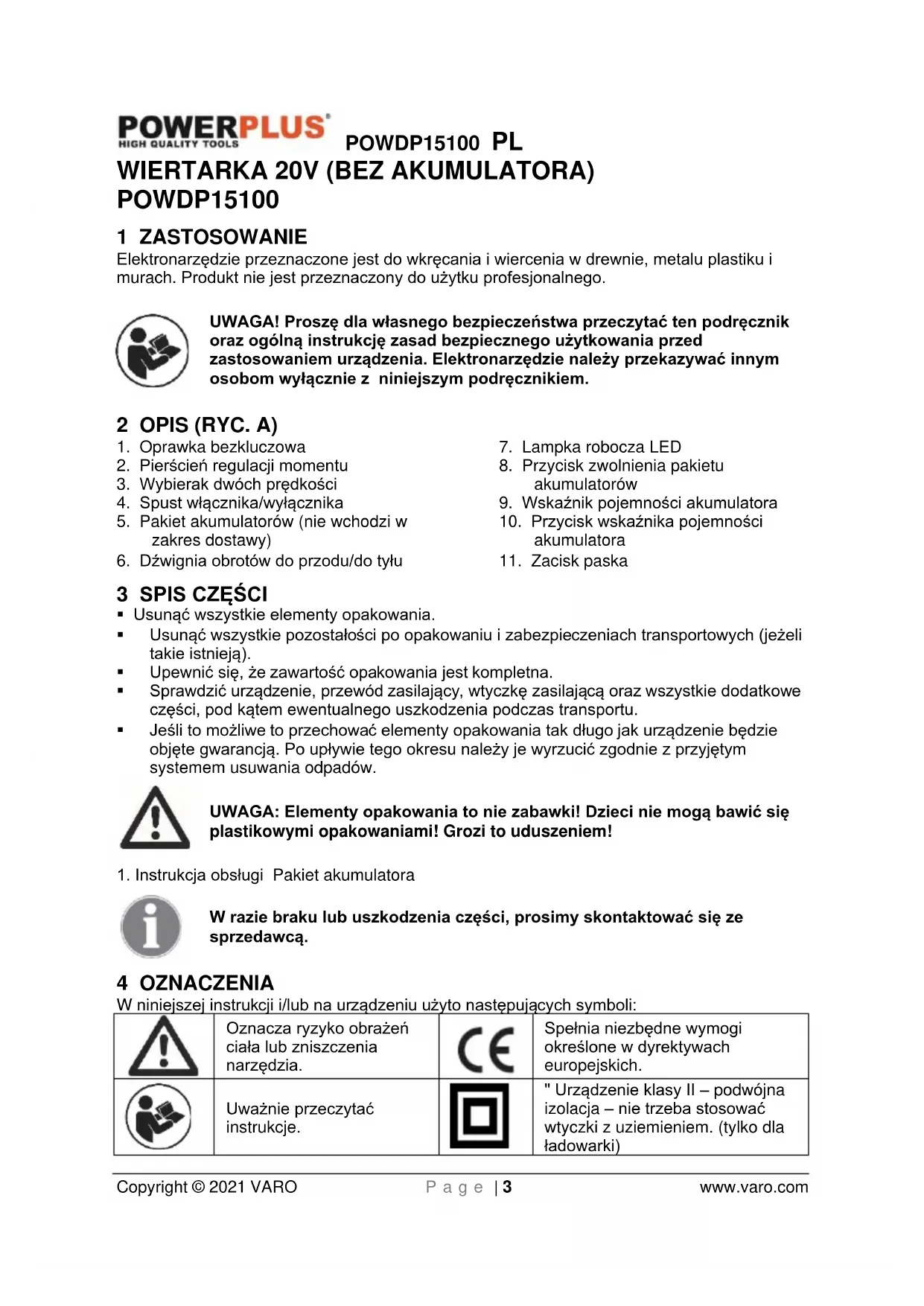" Urządzenie klasy II – podwójna izolacja – nie trzeba stosować wtyczki z uziemieniem. (tylko dla ładowarki)POWDP15100 PL Copyright © 2021 VARO P a g e | 4 www.varo.com