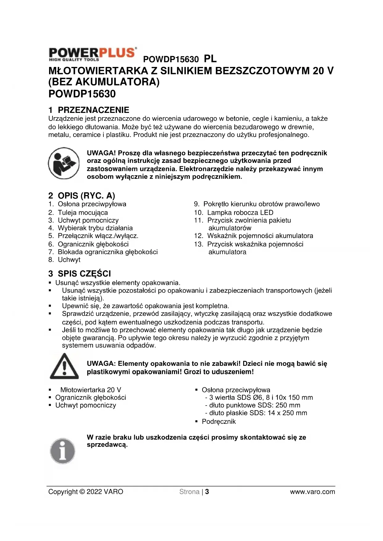 - Do prac związanych z emisją pyłu należy nakładać okulary ochronne i maskę przeciwpyłową.POWDP15630 PL Copyright © 2022 VARO Strona | 7 www.varo.com