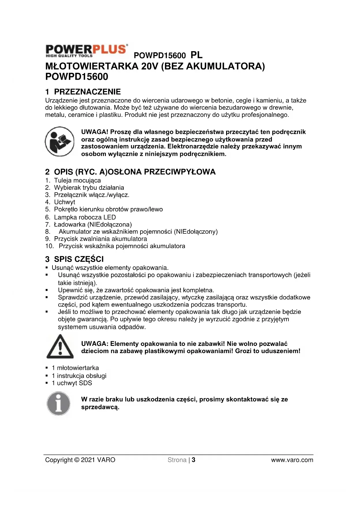 Copyright © 2021 VARO Strona | 3 www.varo.com MŁOTOWIERTARKA 20V (BEZ AKUMULATORA) POWPD15600 1 PRZEZNACZENIE Urządzenie jest przeznaczone do wiercenia udarowego w betonie, cegle i kamieniu, a także do lekkiego dłutowania. Może być też używane do wiercenia bezudarowego w drewnie, metalu, ceramice i plastiku. Produkt nie jest przeznaczony do użytku profesjonalnego. UWAGA! Proszę dla własnego bezpieczeństwa przeczytać ten podręcznik oraz ogólną instrukcję zasad bezpiecznego użytkowania przed zastosowaniem urządzenia. Elektronarzędzie należy przekazywać innym osobom wyłącznie z niniejszym podręcznikiem. 2 OPIS (RYC. A)OSŁONA PRZECIWPYŁOWA