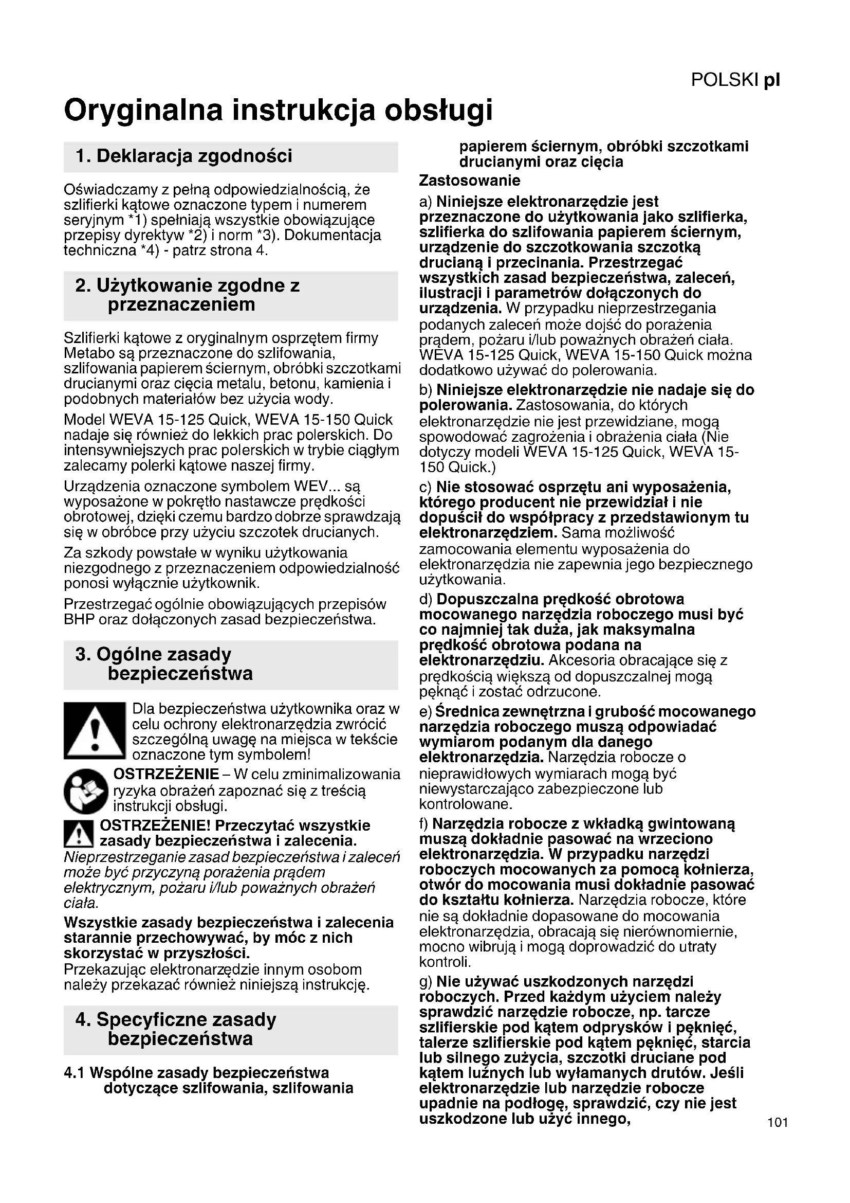 a) Niniejsze elektronarżędzie jest przyznaczone do uzytkowania jako szlifierka, szlifierka do szlifowania papierem sciernym, urzadzenie do szczotkowania szczotka drucianą przycecinania. Przestrzegać wsztkich zasad bezpieczność, zalecen, ilustraciji i parametrów dotączonych do urzadzenia. W przypadku nieprzestrzegania podanych zalecen要去 do sązenia pradem, pozaru i/lub powaznych obrażćciała. WEVA 15-125 Quick, WEVA 15-150 Quickość dodatkowo uzywać do polerowania.